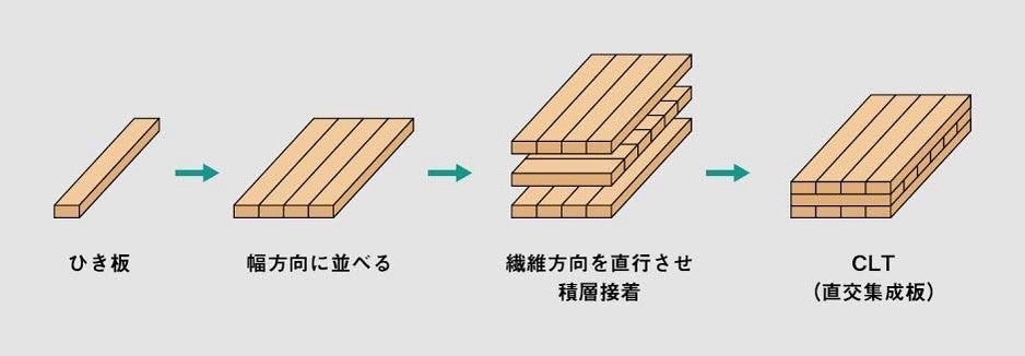 CLT(*)…Cross Laminated Timber(直交集成材)の略称で、ひき材を並べて繊維方向が直交するように積層接着を行った木質系材料です。厚みのある大きな材がつくれることから、建築の構造材、土木用材、家具などに用いられており、断熱性や遮熱性、遮炎性、遮音性など複合的な効果も期待されています。