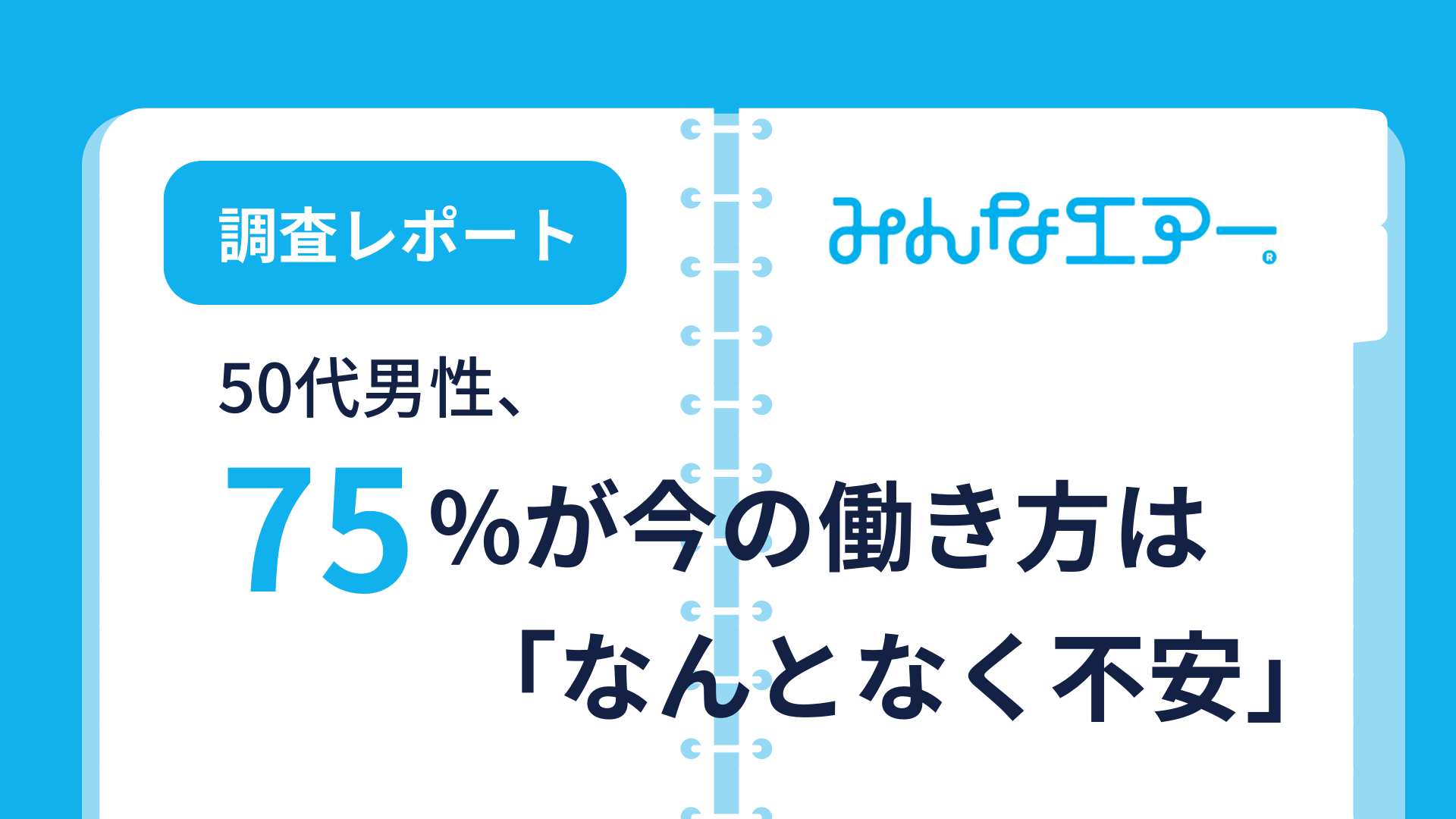 50代男性の75%が今の働き方は「毎日がなんとなくつまらない」や「なんとなく不安」という絶望に近い感情があることが明らかになりました。理由として「今の仕事の閉塞感」(56.0%)や「今後のキャリアの不透明さ」(42.7%)、他にも「毎日同じ事を繰り返して時間を無駄に過ごしているような気がしてならない」という声が挙がりました。さらには65.3%が、そんな不安感を抱えながら、普段は努めて明るく振る舞う実態も判明しました。