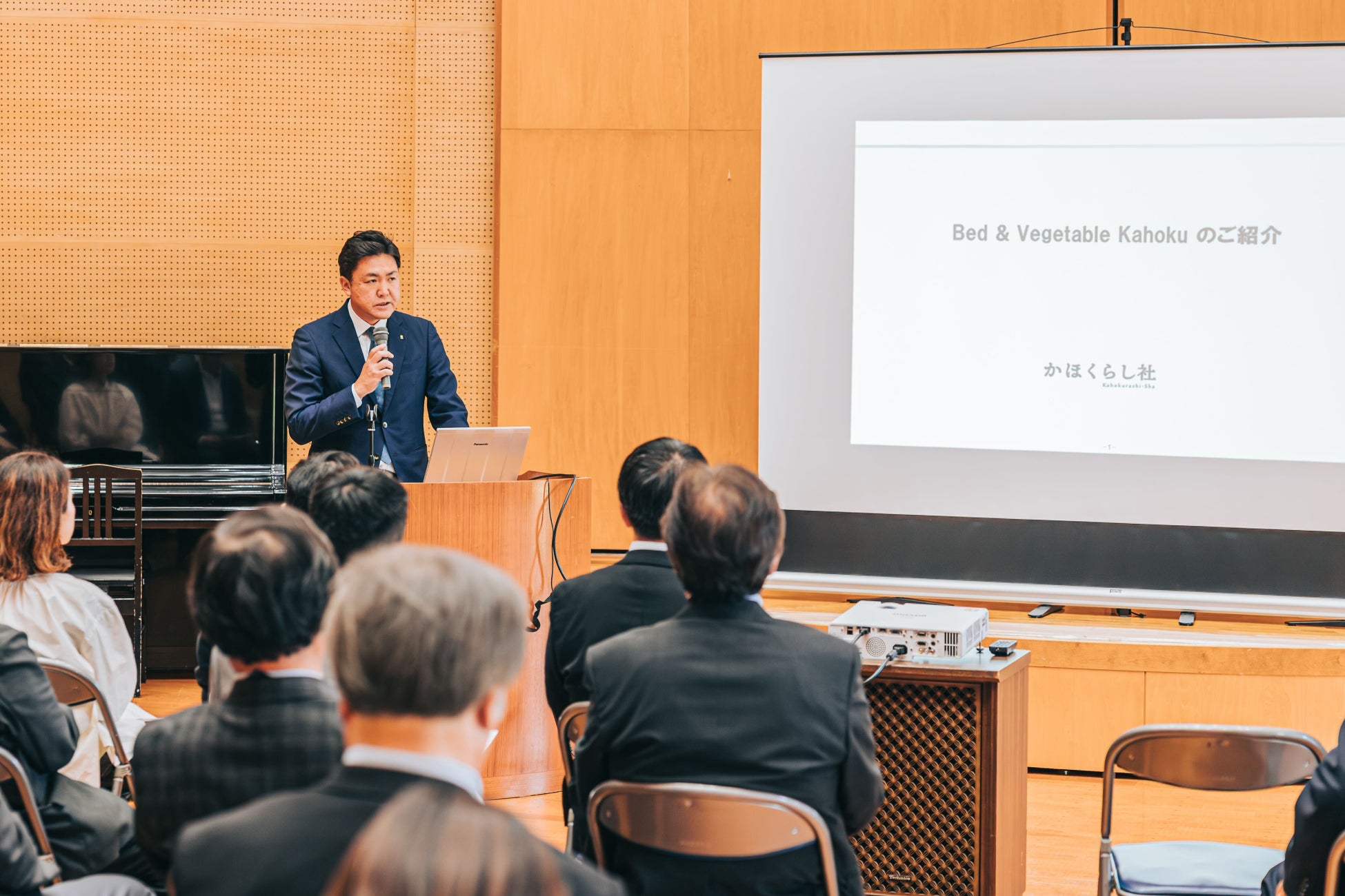 当日は、地域の役場や議会、商工会、金融機関、地域事業者の方々、またホテル開業にご尽力いただいた関係者の方々をお招きし、さとゆめ代表の嶋田が事業説明などを行いました。また、関係者の方々からそれぞれご挨拶をいただいたほか、「Bed & Vegetable Kahoku」にて施設のご案内を行いました。
