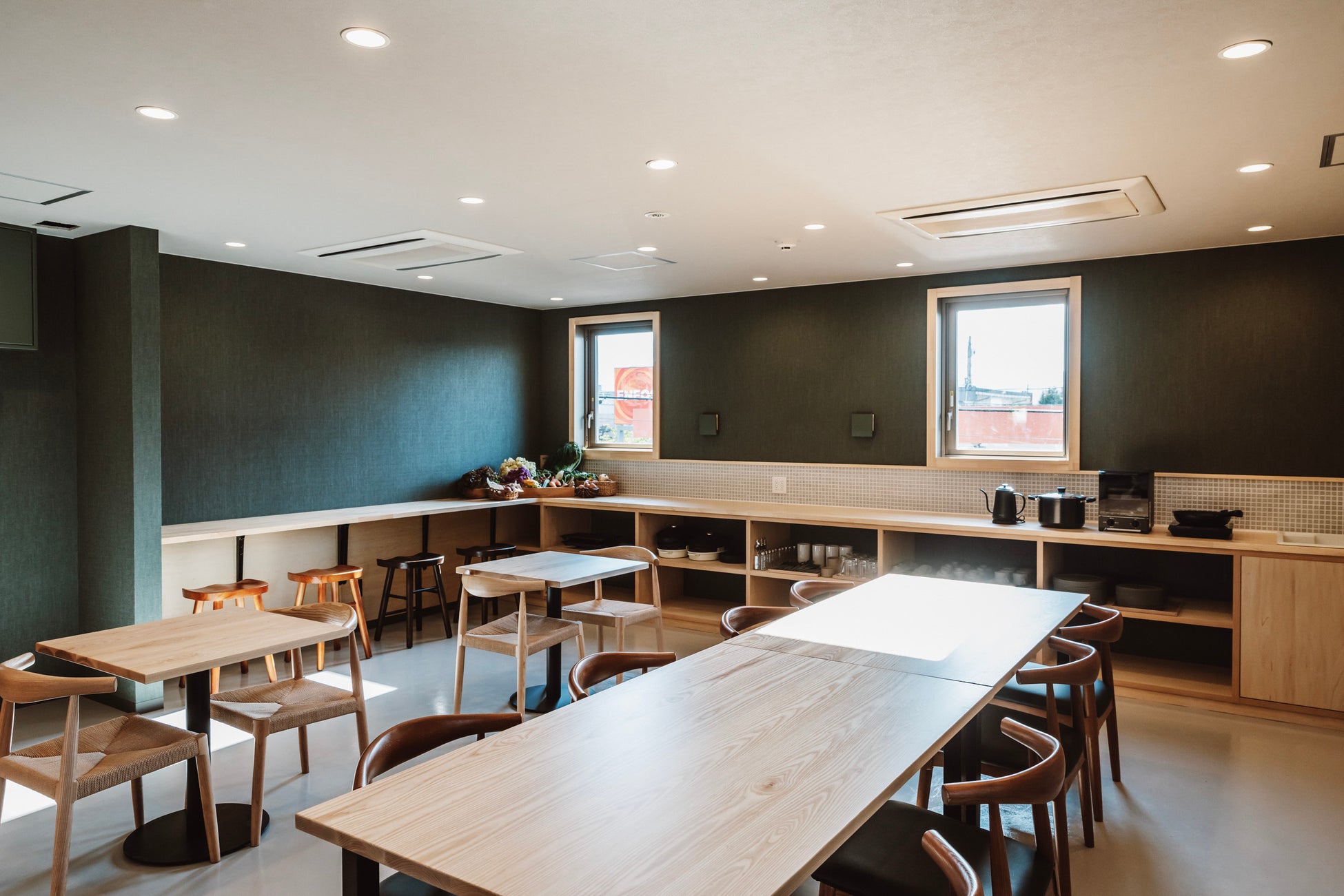 ラウンジは、宿泊客の方が自由に過ごしていただける場所となっています。20:00~22:00はバータイムとなり、地域のおつまみや飲み物等をご用意しています。(※1)また、同じフロアにある飲食スペースには調理器具を備えており、地域で購入された食材等の調理にご利用いただけます。