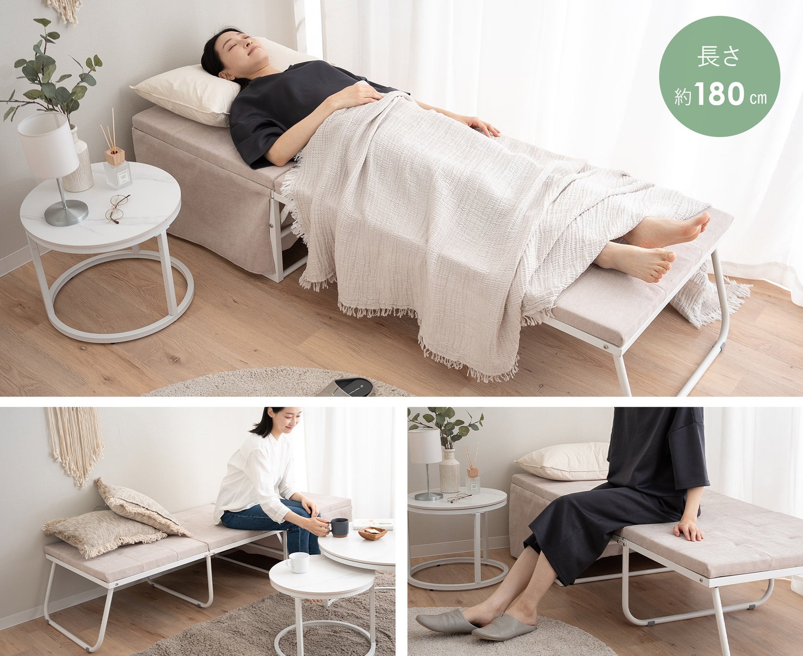 ベッドにすると約180㎝のフラットな寝床に。一般的な簡易ベッドに比べても広く、脚を伸ばしてゆったり眠れます。ベッドだけでなく、広げた状態では3人掛けのベンチとしても使用可能です。