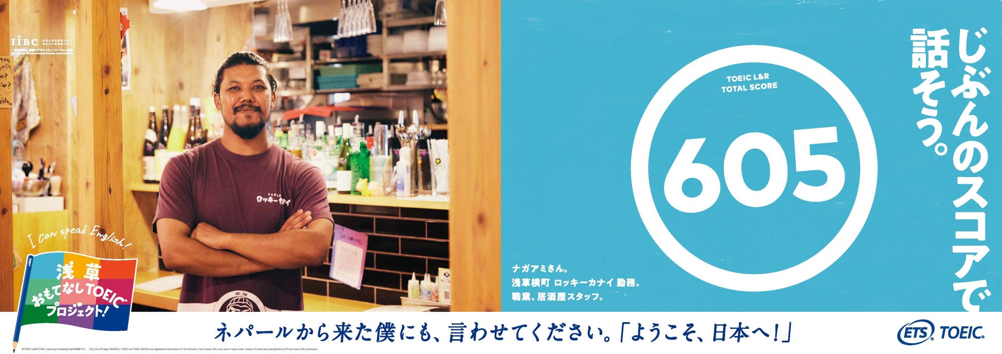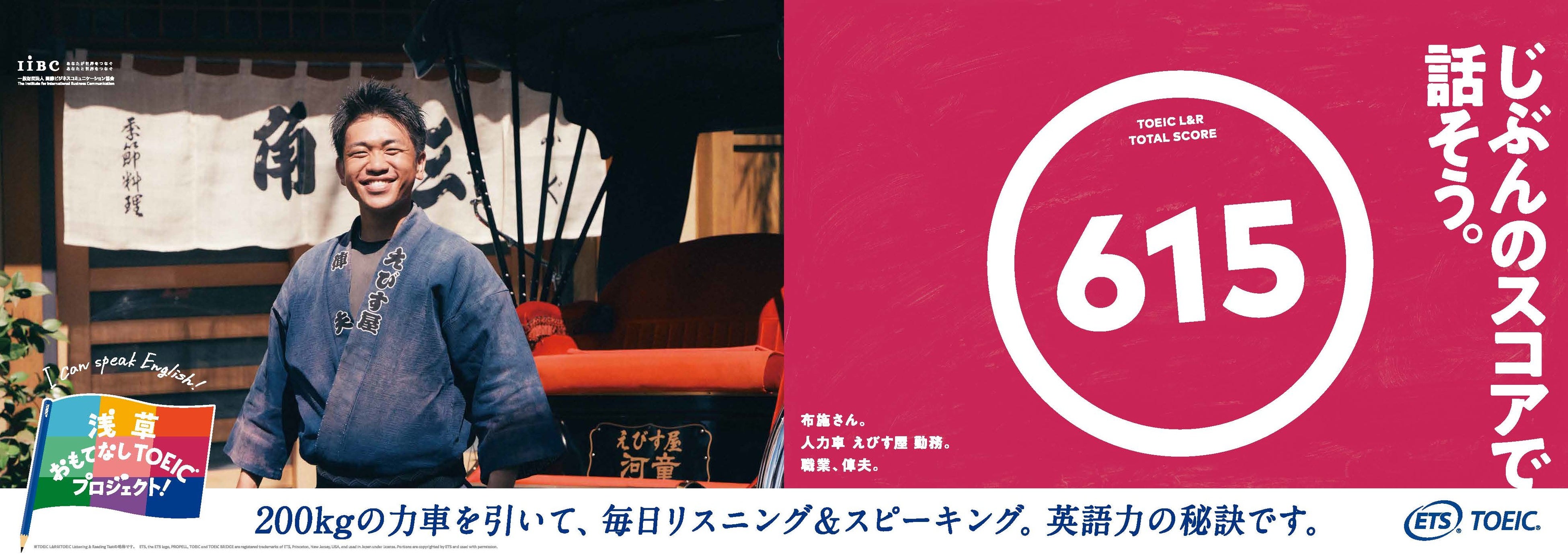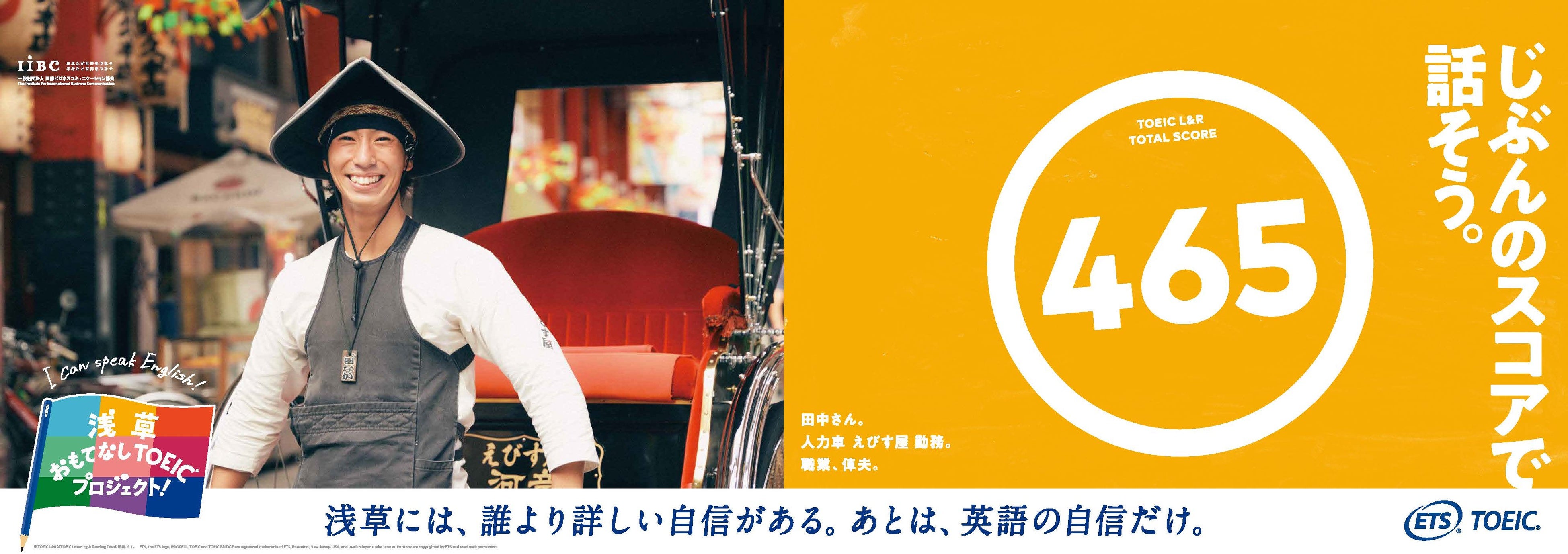 世界で英語を話す人は約15億人。そのうち母語が英語でないノンネイティブスピーカーは約11億人いると言われています。(*³)日本を訪れる外国のお客様も例外ではないはず。だから、おもてなしの現場においては、必ずしもネイティブスピーカーのような流暢な英語が話せなくても、コミュニケーションは十分できると私たちは思います。このプロジェクトでは、浅草の人力車の俥夫や着物レンタル店の着付け師、またネパール出身の居酒屋スタッフなど、日頃から「等身大の英語」を使っておもてなしに励む9名の方々がTOEIC Listening & Reading Testを受験。それぞれの「今の英語力」を測定した結果とともに、日々英語でのおもてなしに向き合うポジティブなメッセージを広告に載せて発信します。この9名が実際にテストを受験する様子や、それぞれのおもてなしの現場である浅草の街中でグラフィック撮影に挑戦するシーン、そしてこのプロジェクトを通して変化した英語への想いなども動画で公開。