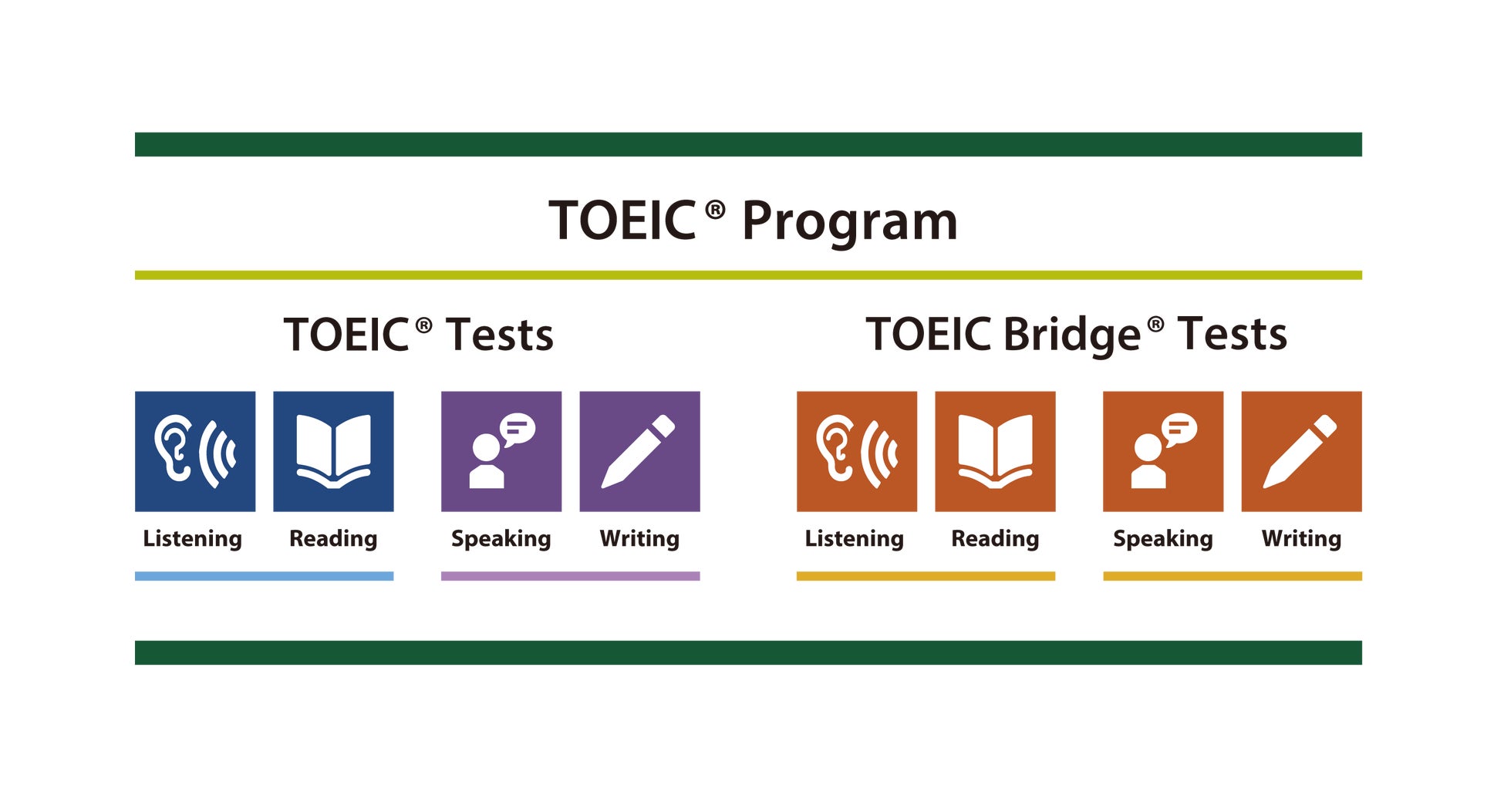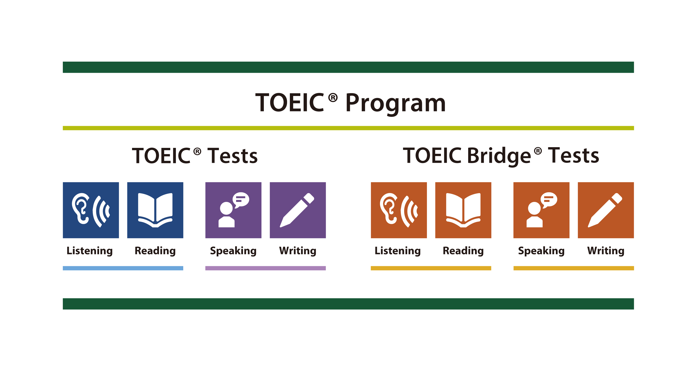 TOEIC® Listening & Reading Test、TOEIC® Speaking & Writing Tests、TOEIC Bridge® Listening & Reading Tests、TOEIC Bridge® Speaking & Writing Testsの総称。4つのテストを合わせたTOEIC® Programは世界160カ国、約14,000団体で実施されている。