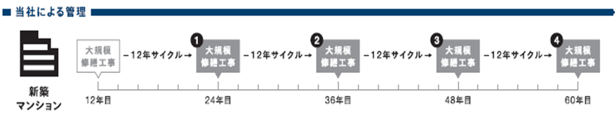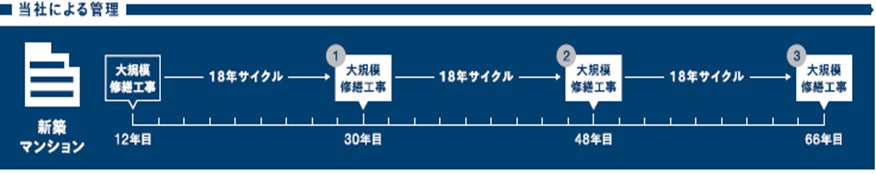 当社が責任を持って元請工事を実施することにより、工事アフターサービス保証の期間を延長し、大規模修繕工事の長周期化を可能とする長期保証プランです。一般的な仕様では12年ごとに当該工事が計画されるところ、最大18年ごとの周期とすることができます。