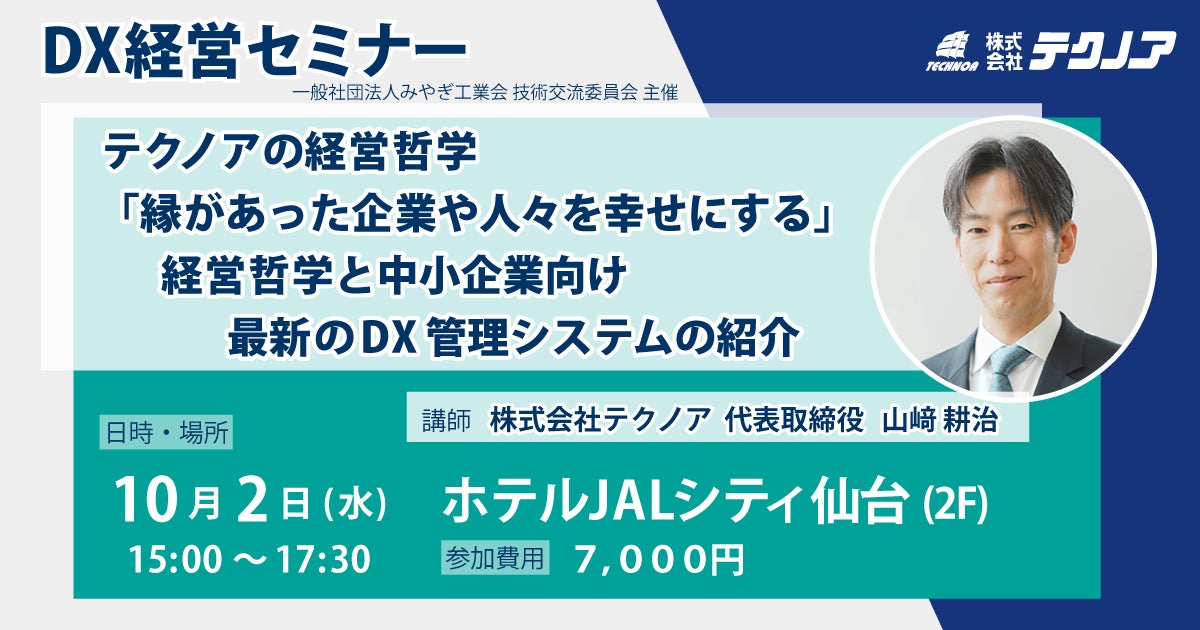 株式会社テクノア(本社:岐阜県岐阜市、代表取締役:山﨑 耕治 以下、テクノア)の、代表取締役 山﨑 耕治(以下、山﨑)は、2024年10月2日(水)に、仙台市のホテル JALシティ仙台 で開催される「DX経営セミナー」に登壇いたします。