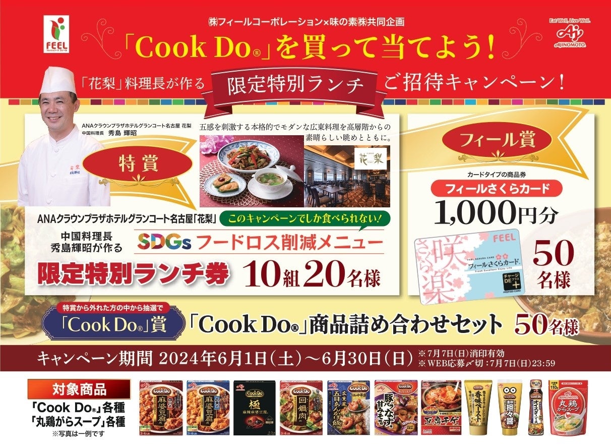 6.1(土)~6.30(日)の期間、株式会社フィールコーポレーション×味の素株式会社 名古屋支社 共同企画【「Cook Do®」を買って当てよう!】キャンペーンの特賞として、中国料理「花梨」 中国料理長 秀島輝昭が、SDGsフードロス削減メニュー限定特別ランチを考案し提供します。