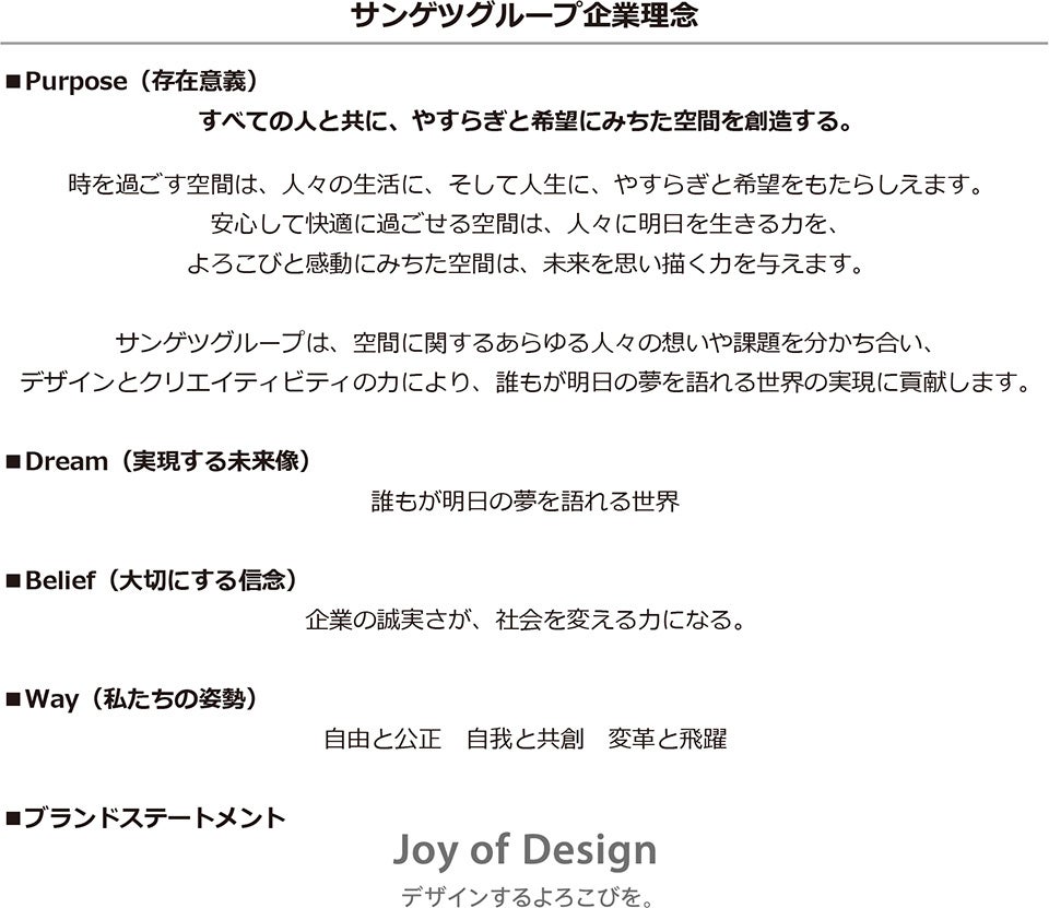 参考資料 英訳版 サンゲツグループ企業理念:https://prtimes.jp/a/?f=d54227-119-5a97bf4cf2e2639615372217f05fde85.pdf