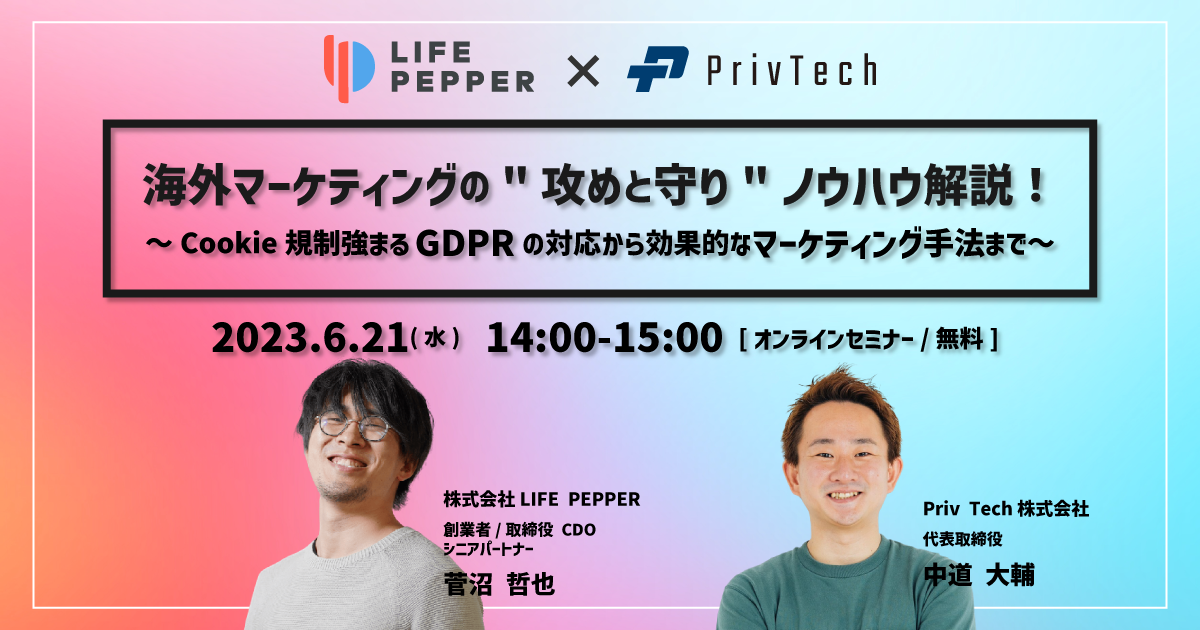 LIFE PEPPERと共催で、海外向けにマーケティング活動を行う企業様向けに、Cookie規制が強まるGDPR等の海外プライバシー法の対応ポイントから、効果的なマーケティング手法を解説する無料オンラインセミナーの開催が決定いたしました。お誘い合わせの上、奮ってご参加ください。