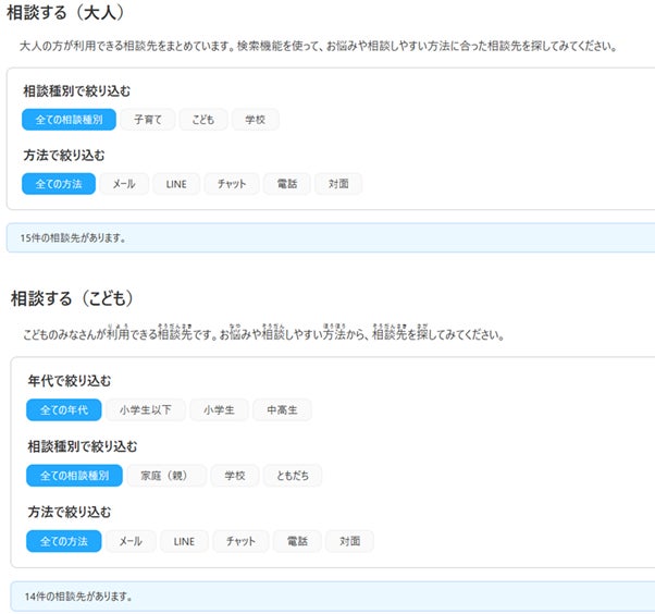 「相談する」機能では、「大人」と「こども」の入り口を分けることで、利用者が自分の立場に合った相談先に迷わずたどり着けるようにしました。さらに、相談内容や相談方法で絞り込める検索機能を備え、悩みや状況に応じて相談窓口を選びやすくしています。