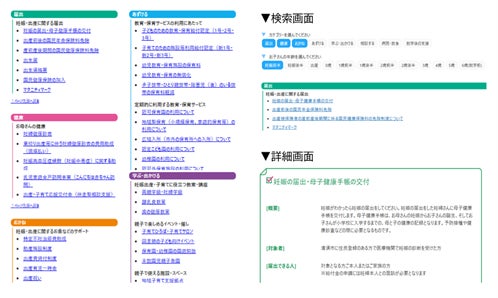 妊娠・出産、保育、健康、経済的支援などの行政サービスをはじめ、児童館や公園などのお出かけスポット、地域イベント情報などを網羅。お子さんの年齢や目的に応じて、知りたい情報を簡単に検索できます。