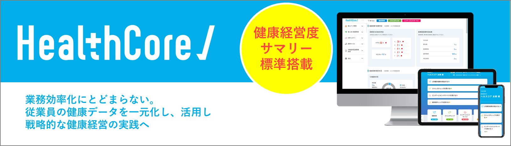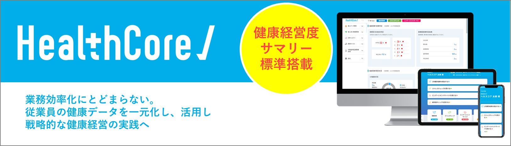 健康管理システム『HealthCore(ヘルスコア)』は、従業員の健康データの一元管理や業務効率化の実現はもちろん、データを活用し戦略に健康経営を実践するための健康管理システムです。「健康診断の結果は、事後措置の後は、ただ保管しているだけ…」「ストレスチェックの実施のみでは、限界を感じている…」「健診とストレスチェック、さらに個人の労働時間を掛け合わせて分析すれば、もっと有効な指標が得られると思うが、その時間もノウハウもない…」等、部分的な施策の限界、データの管理・活用に課題を感じられている企業様、ぜひブースへお立ち寄りください。
