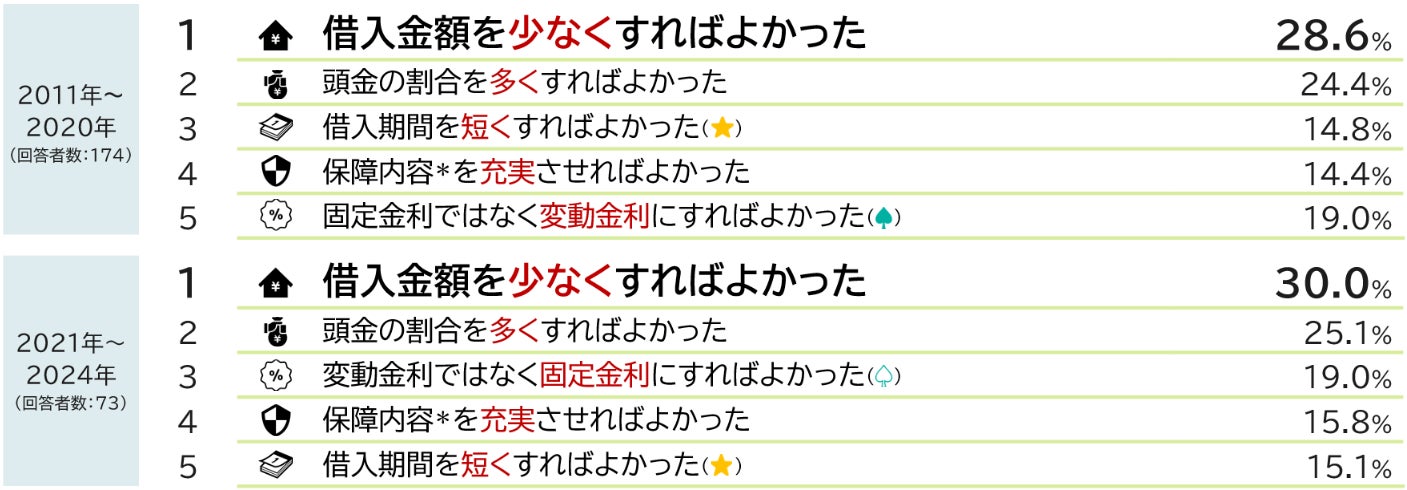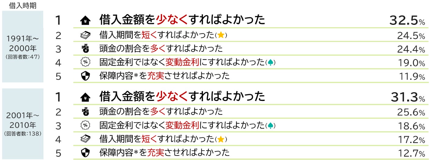 他方、「借入期間を短くすればよかった」は、借入時期が古い(=返済期間が長い)ほど上位にランクインする傾向がみられました(図表4内★)。借入期間に関する後悔は、借り入れ当初には実感しにくいものの、長年にわたる返済を経験する中で、その「道のりの長さ」に気付き、後悔する人が増えているものと思われます。また、借入金利に対する後悔も、2021年以前は「固定金利ではなく変動金利にすればよかった(図表4 内♠)」が挙げられていたものの、2021年以降では「変動金利ではなく固定金利にすればよかった(図表4 内♤)」に変化しており、時代ごとに多く選ばれていた金利形態の推移が伺える結果となっています。