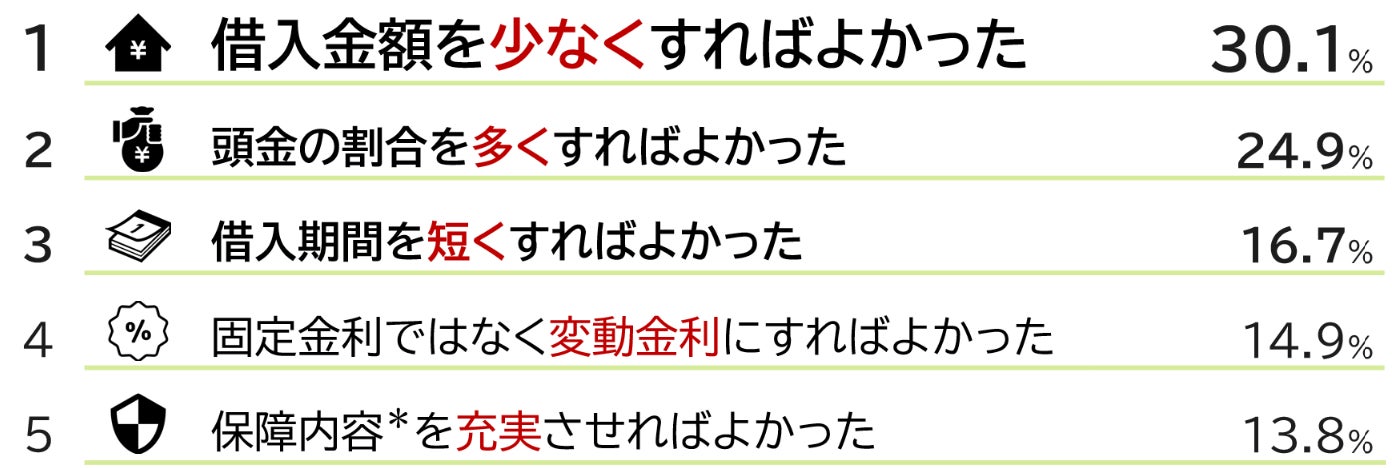 また、「保障内容を充実させればよかった」が、他のランキングに比べても上位に挙げられています。ペアローンでは借主が2人となるため、どちらかに万が一のことがあった場合のリスクも、ケースによっては大きくなります。その分、しっかりと備えておくことの重要性を、より強く感じている方が多いようです。