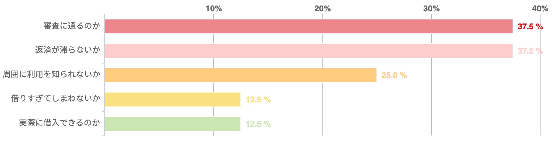 アンケートによれば、不安を感じた主な理由としては「審査に通るのか」と「返済が滞らないか」がそれぞれ37.5%の回答者から挙げられた。