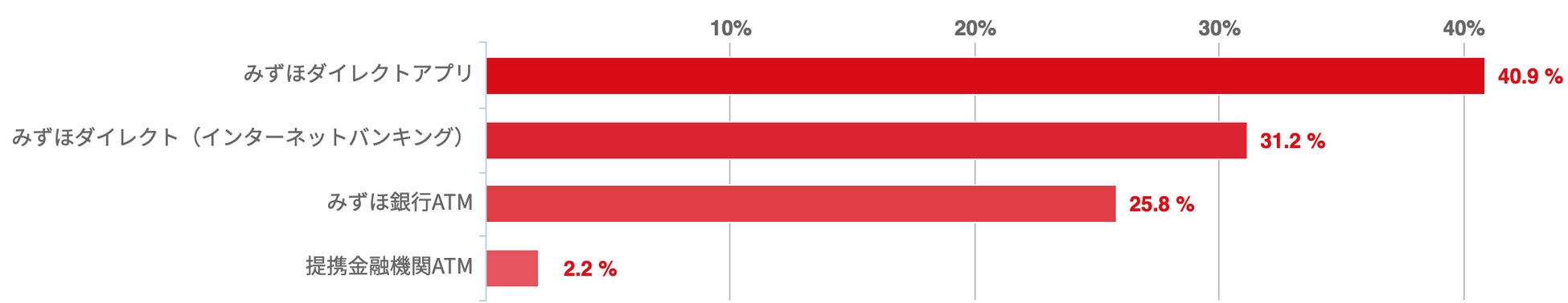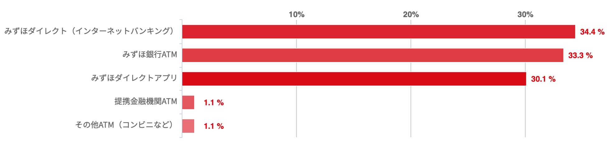 アンケートによれば、「みずほダイレクト(34.4%)」、「みずほ銀行ATM(33.3%)」、「みずほダイレクトアプリ(30.1%)」の3種類が主な借入手段として利用されていることがわかった。
