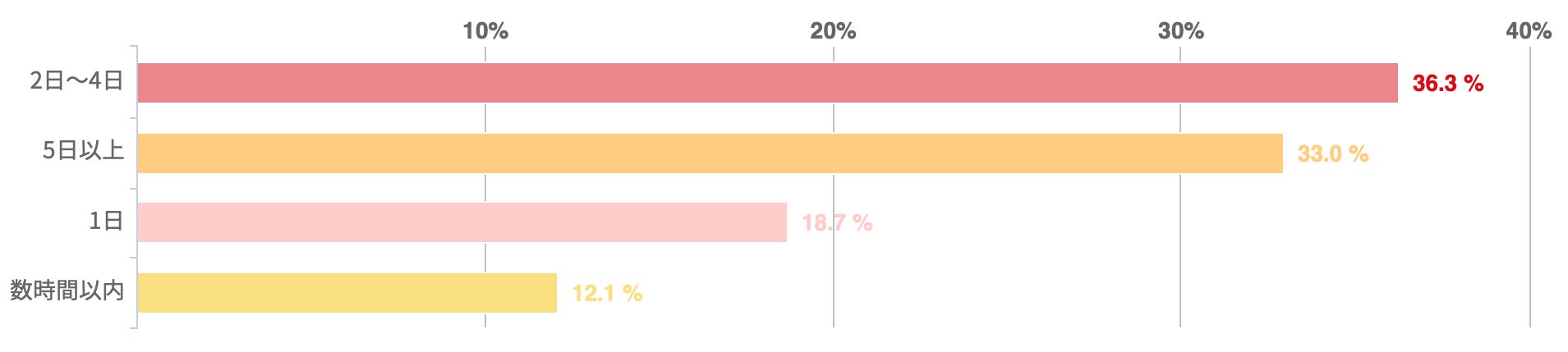 アンケートによれば、受け取るまでの時間としては「2日〜4日(36.3%)」と「5日以上(33.0%)」という回答が主に寄せられた。そこから、「1日(18.7%)」「数時間以内(12.1%)」が続き、当日中に借入ができた回答者は少数派であった。