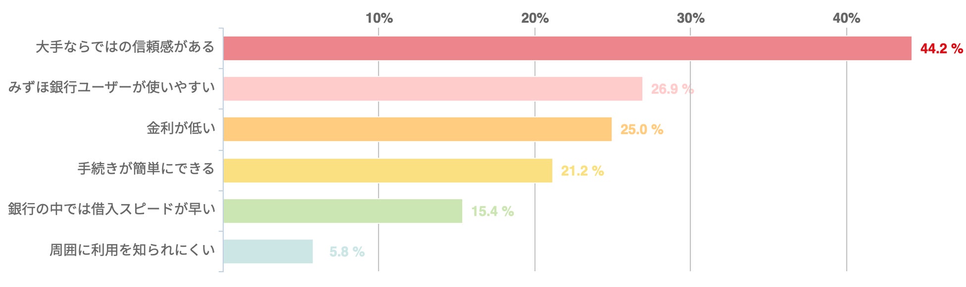 また、「みずほ銀行のユーザーが使いやすい(26.9%)」点と「金利が低い(25.0%)」点も一定数のユーザーから支持されており、特に「口座を保有していれば審査時間を短縮できる」点は複数の回答者から挙げられている。