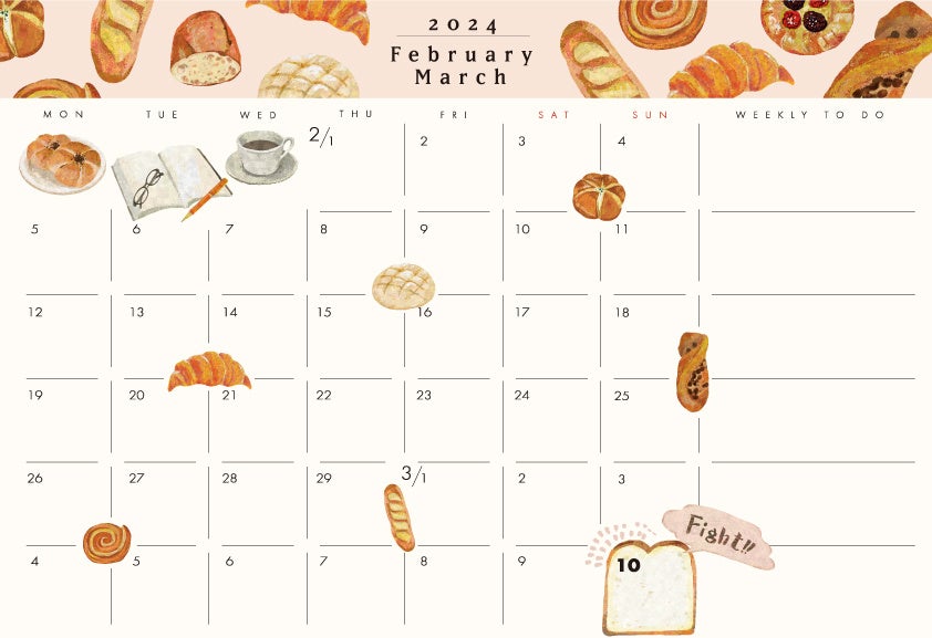 第28回パンシェルジュ検定申込者の皆様へ、試験勉強が楽しくなるパンカレンダーをプレゼント! 2月1日から試験日までのパンシェルジュ検定受験者特別仕様になっているので、試験日までお気に入りのパンシールやTODOリストなどを活用して、世界に一つだけのパンカレンダーが作れます!”#みんなでパンシェルジュ”を付けてSNSで投稿し、パン好きの輪を広げよう!