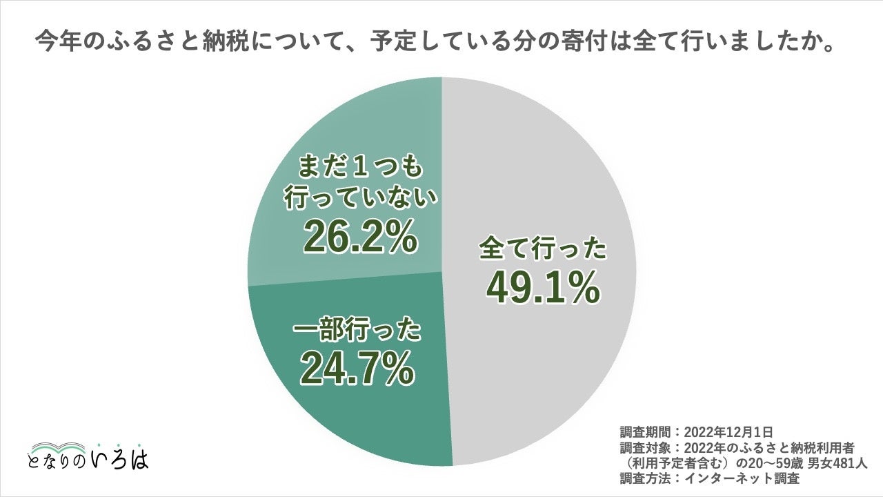 まず調査を行った12月1日時点での寄付状況について聞いてみると、今年予定している分の寄付を全て終わらせている人は半数以下(49.1%)。「一部行った」(24.7%)、「まだ1つも行っていない」(26.2%)を合わせた半数以上(50.9%)は、これから寄付を行う予定があるという結果になりました。寄付後の税金控除手続きまで含めると、年末ギリギリの“駆け込み寄付”を行う予定の人が多いと考えられます。
