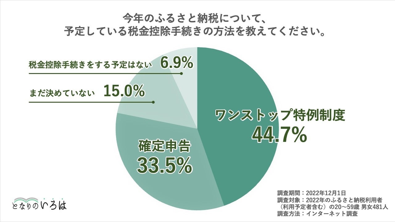 次に、税金控除手続きをどの方法で行うかを調査。その結果「ワンストップ特例制度」が44.7%、「確定申告」が33.5%となりました。「まだ決めていない」(15.0%)と回答した方を考慮すると、ふるさと納税利用者の約半数が「ワンストップ特例制度」を利用して税金控除手続きを行う可能性が高いことがわかります。