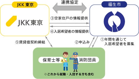 JKKは福生市と連携協定を締結し、保育士等と消防団員を対象に、市内の2つのJKK住宅への申込受付や、空室発生時に優先的に入居ができる待機者登録の受付を行います。