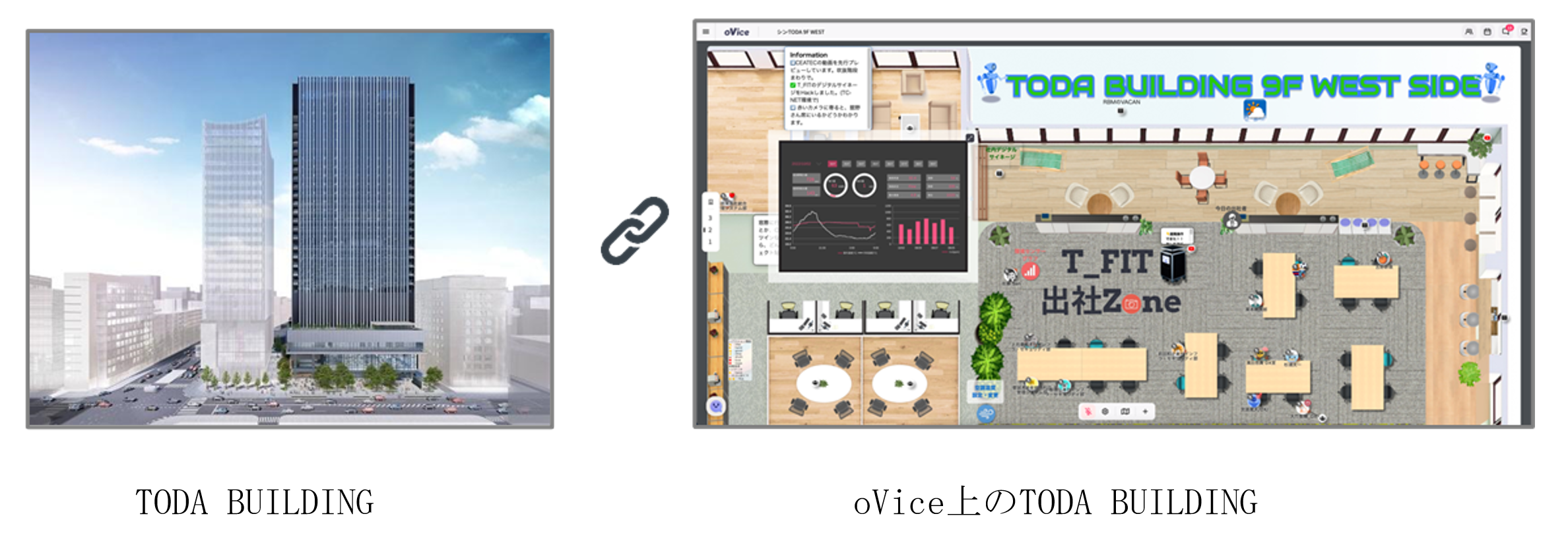 両社は現在、戸田建設T_FIT HATCHOBORI本社ビルをモデルに連携を開始しています。また、戸田建設はTODA BUILDING竣工の前にoVice上のバーチャルTODA BUILDINGをオープンし、リアルオフィスのレイアウト検討などに活かしていく考えです。