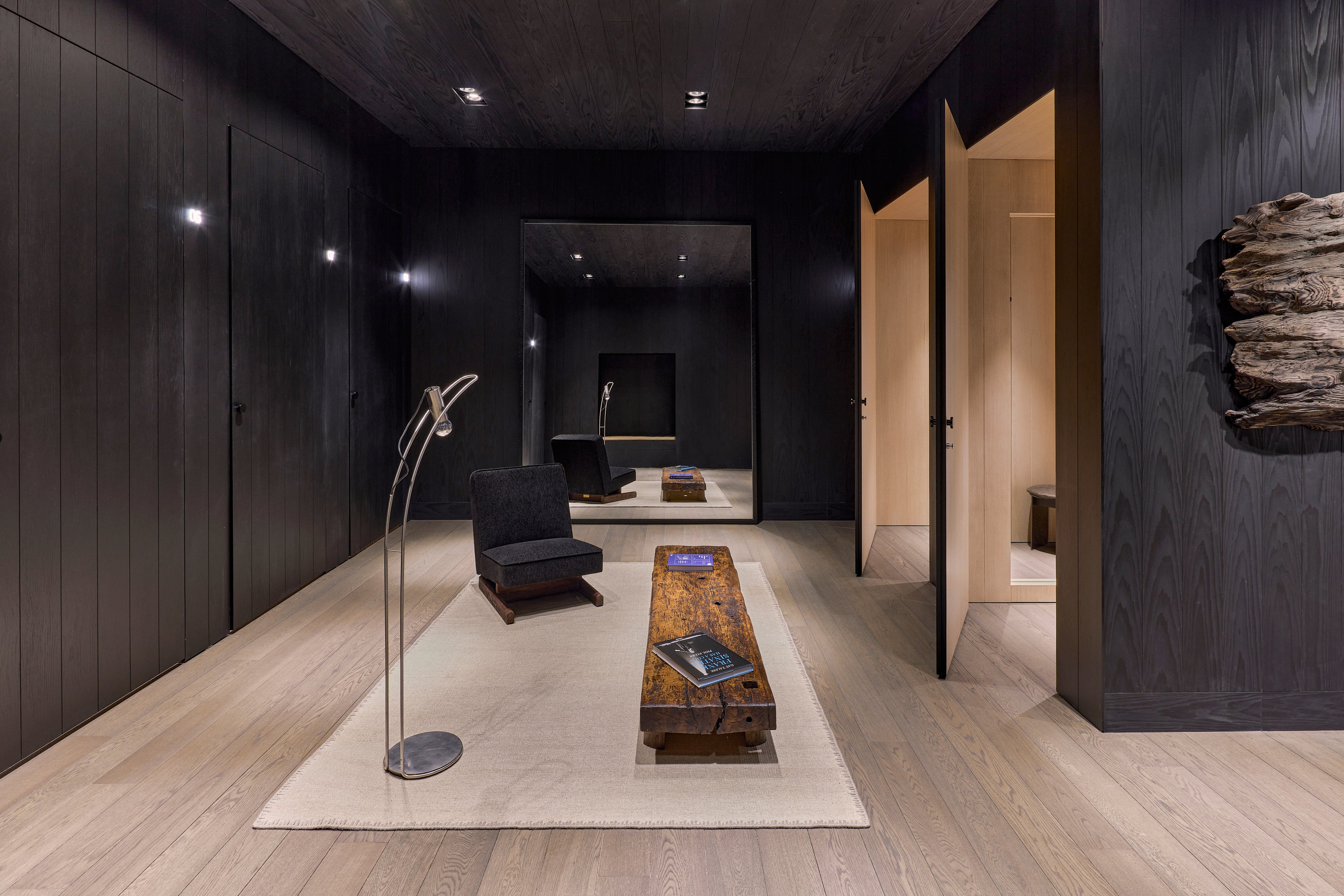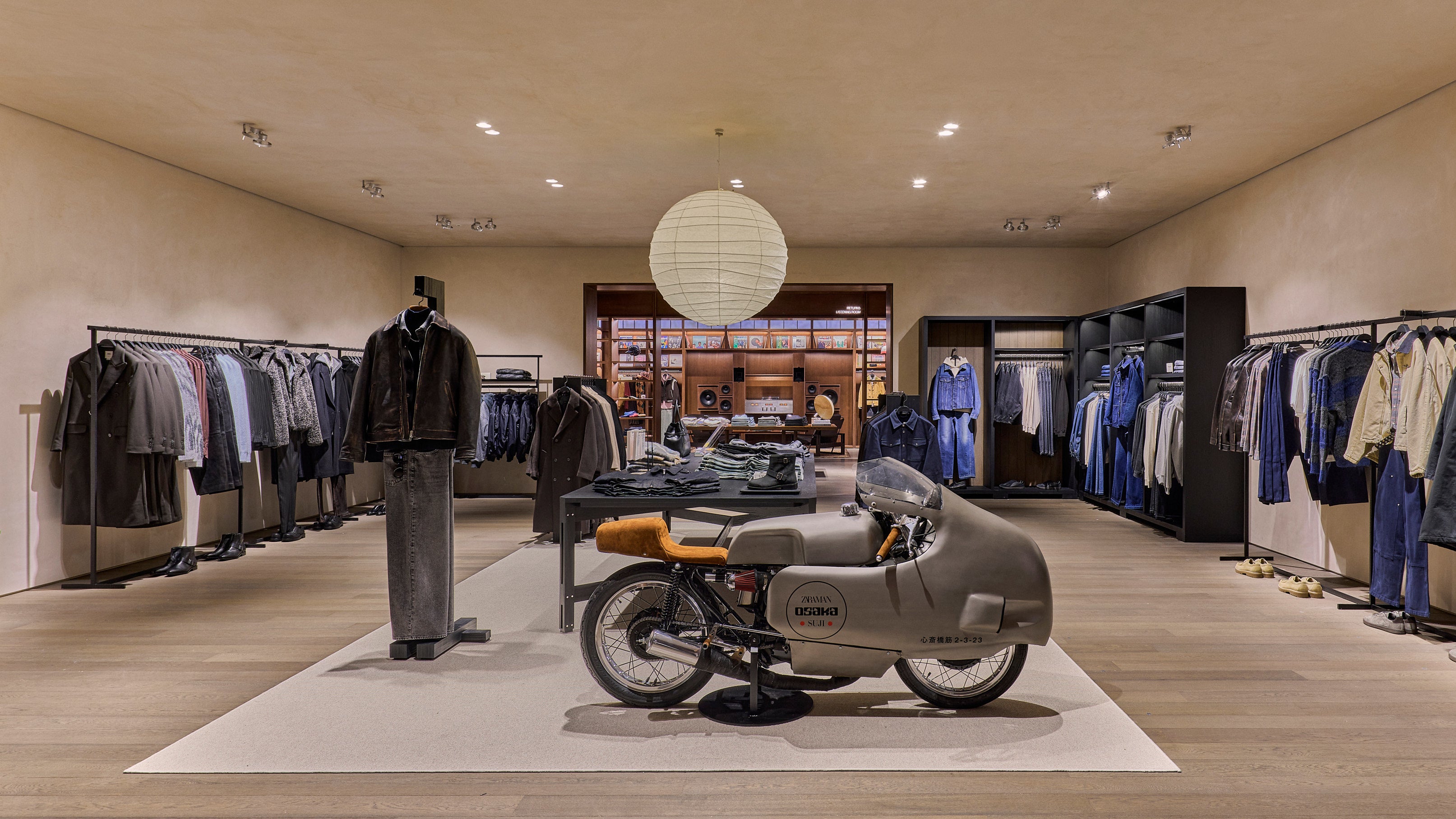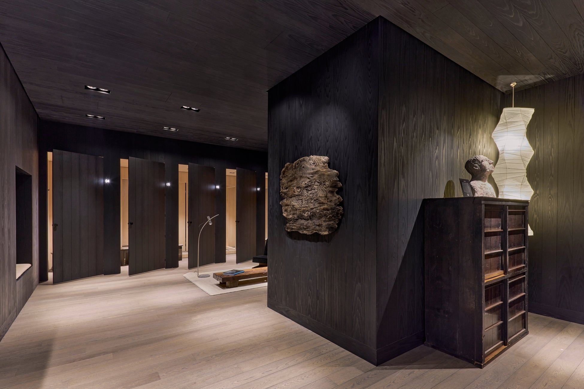 店内は、ダークウッドの壁面とシームレスなコンクリート床で構成された開放感あふれるエントランスホールからはじまり、スペイン産の石灰岩による彫刻的な階段が2フロアを優雅につなぎます。インテリアは、再解釈したスヌケ材、明るい漆喰仕上げの壁面、日本のグレーウッドが共存する一連のつながりのある空間として展開し、素材の質感と雰囲気が調和する世界観を生み出しています。また、奥には日本の障子を想起させるスクリーンが繊細な影を落とし、静謐なムードを演出。ヴィンテージのモーターサイクルが都会的なアクセントをもたらします。