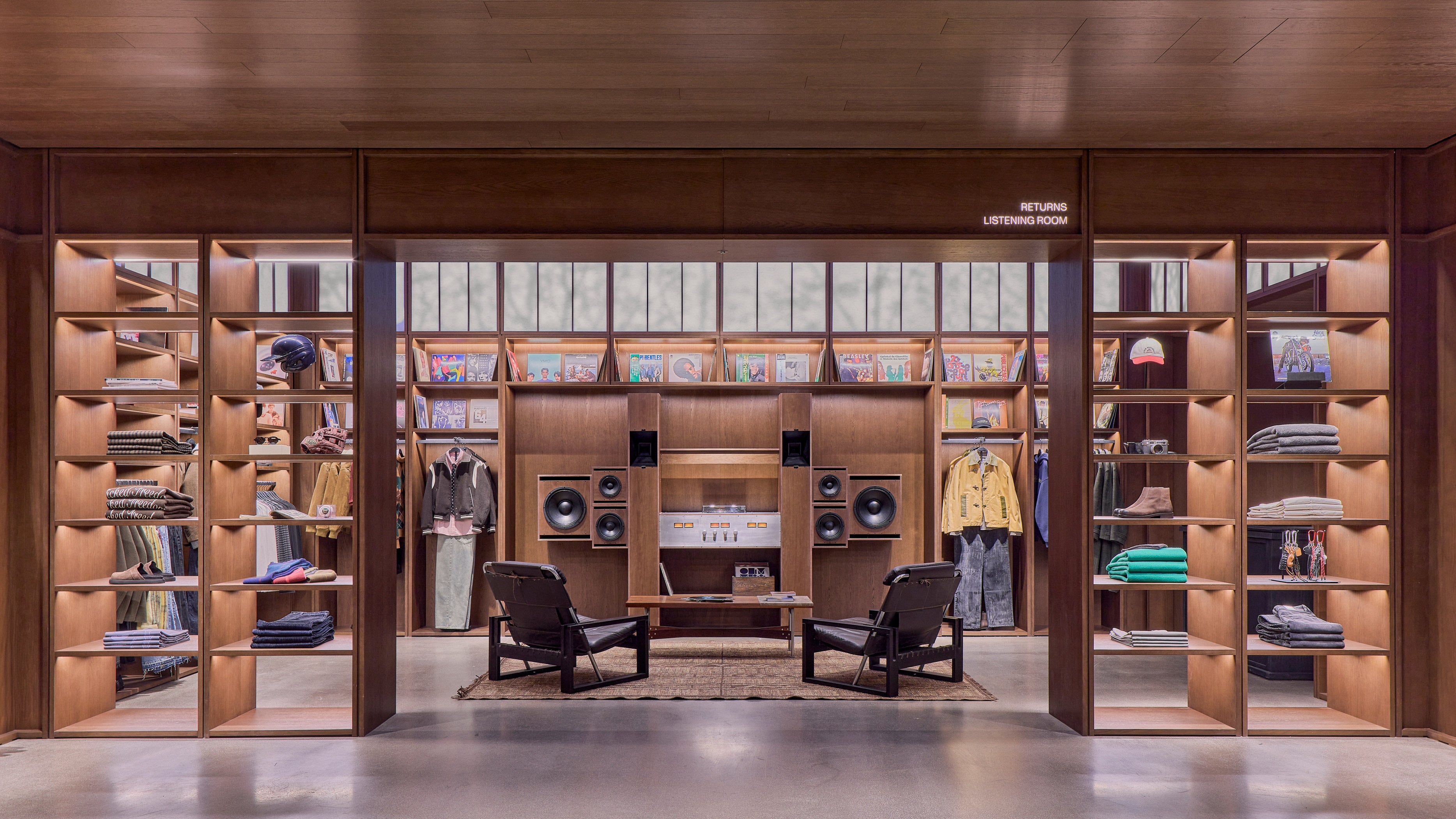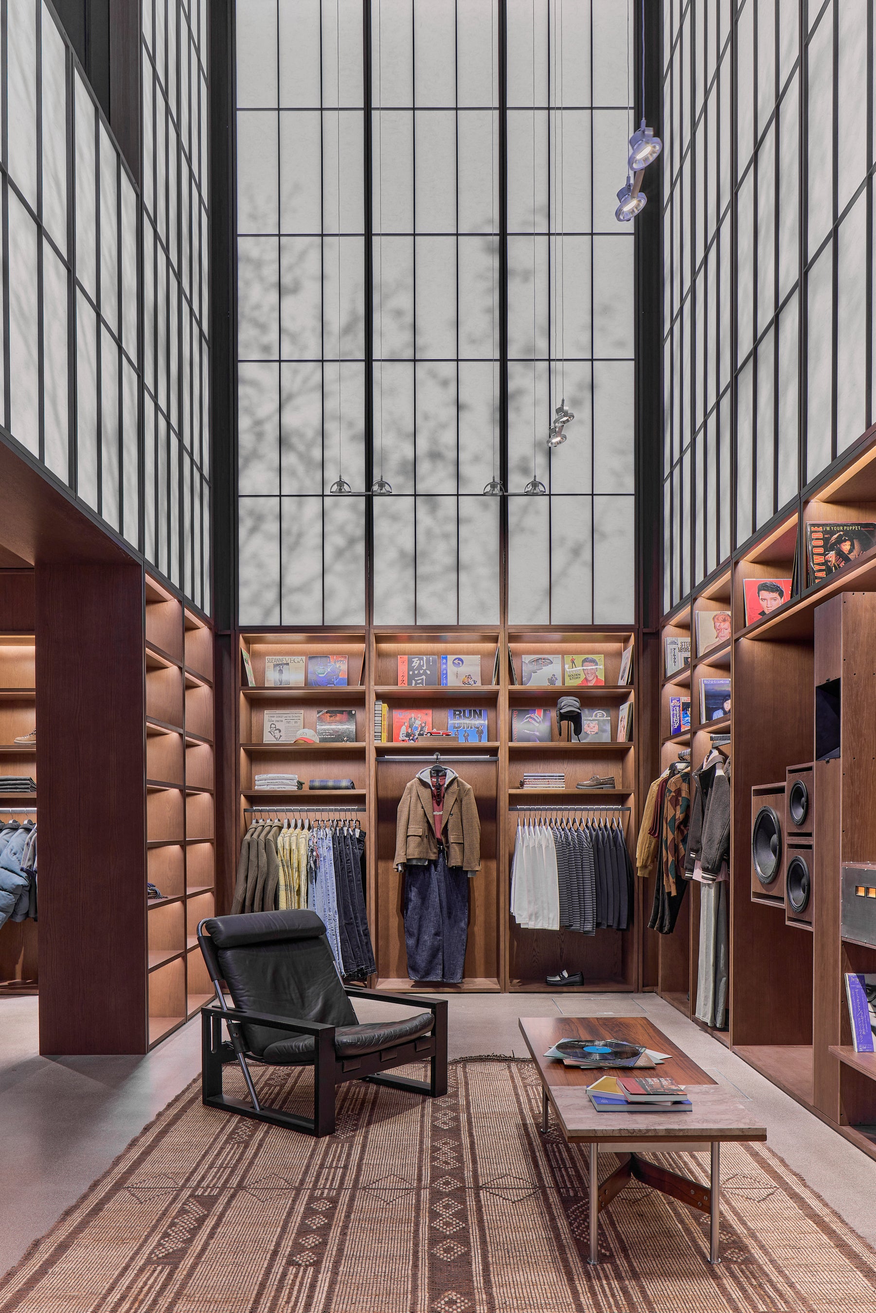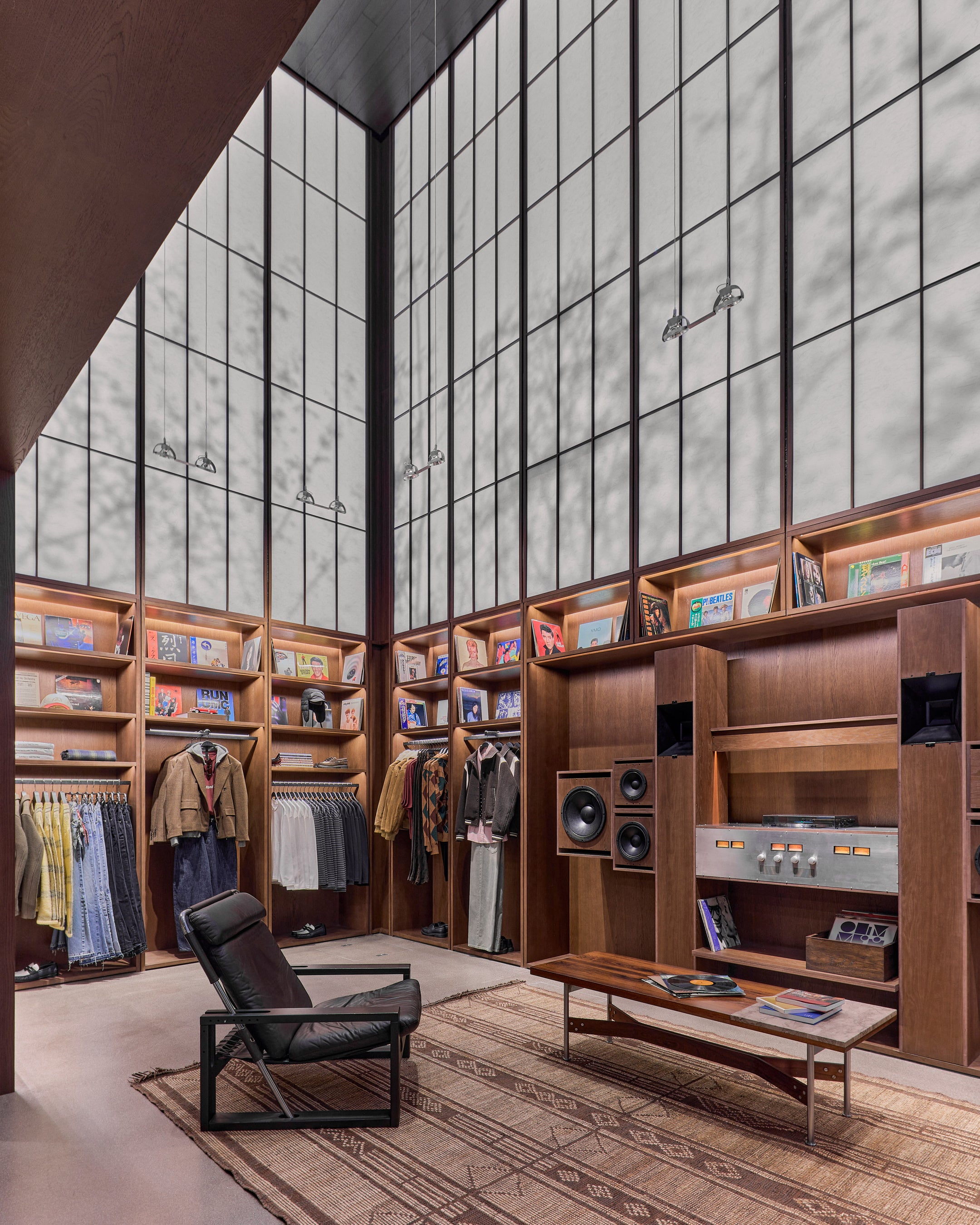 体験の終着点となるのは、「リスニングルーム」。同空間は”素材そのものが音に耳を澄ます”というコンセプトのもと、スペイン人アーティストのルーカス・ムニョス(Lucas Muñoz)によるカスタムスピーカーとレコードを通じて、音がストアの物語と調和する感覚を味わうことができます。障子に着想を得た吹き抜けの大窓には、微かに揺れる樹々の影が映し出され、まるで空間に残響する音のように静かに漂います。