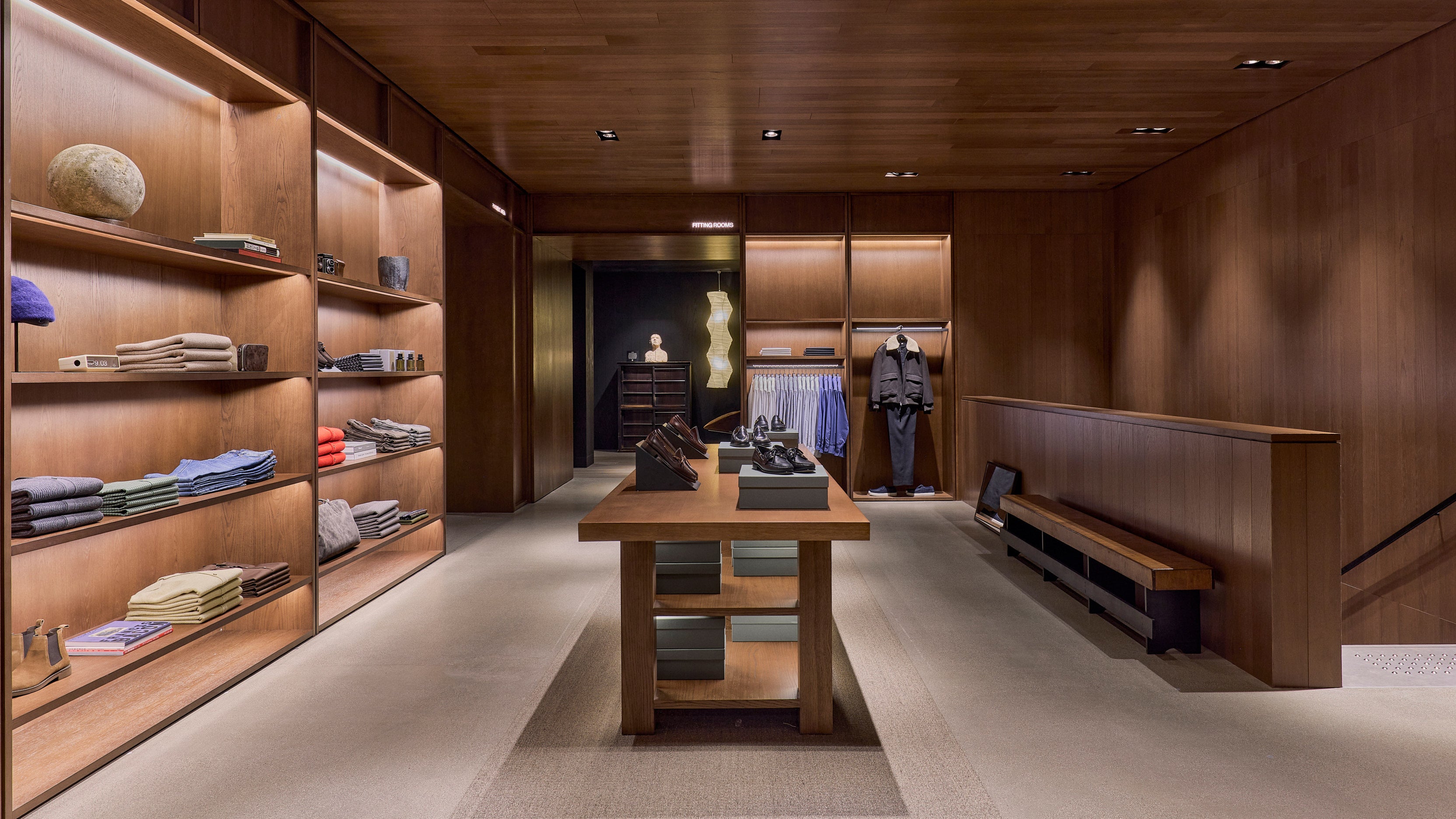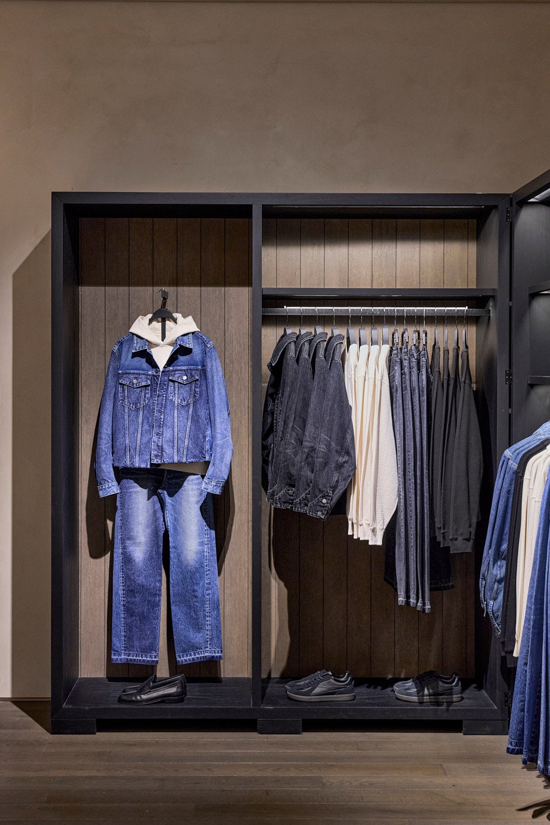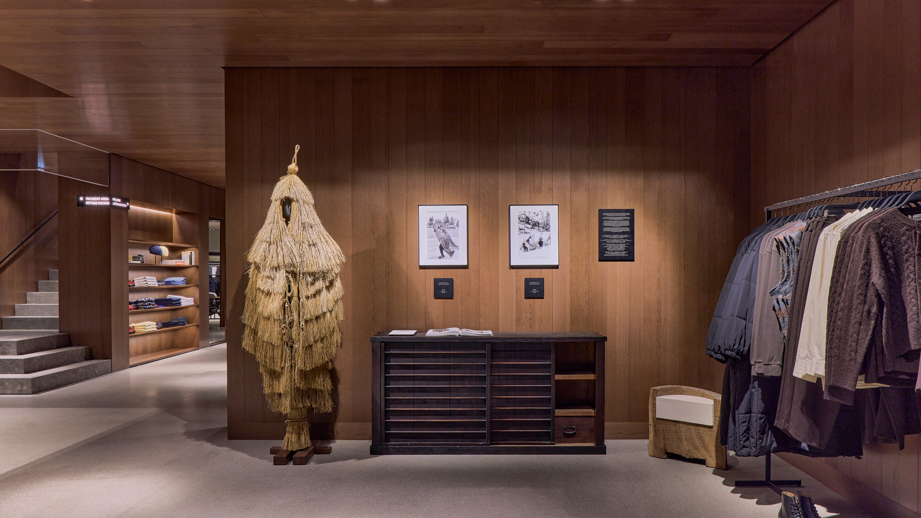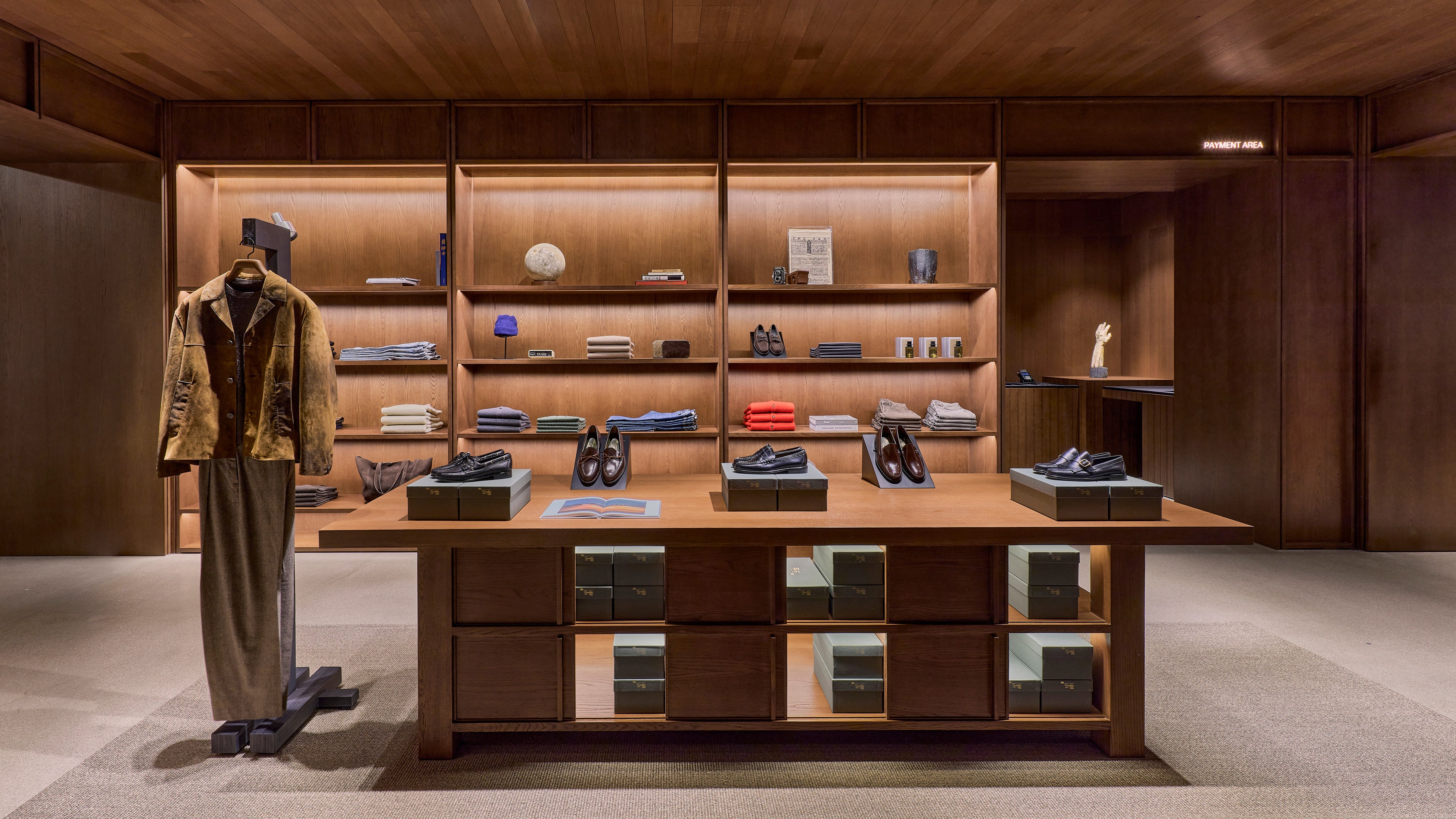 体験の終着点となるのは、「リスニングルーム」。同空間は”素材そのものが音に耳を澄ます”というコンセプトのもと、スペイン人アーティストのルーカス・ムニョス(Lucas Muñoz)によるカスタムスピーカーとレコードを通じて、音がストアの物語と調和する感覚を味わうことができます。障子に着想を得た吹き抜けの大窓には、微かに揺れる樹々の影が映し出され、まるで空間に残響する音のように静かに漂います。