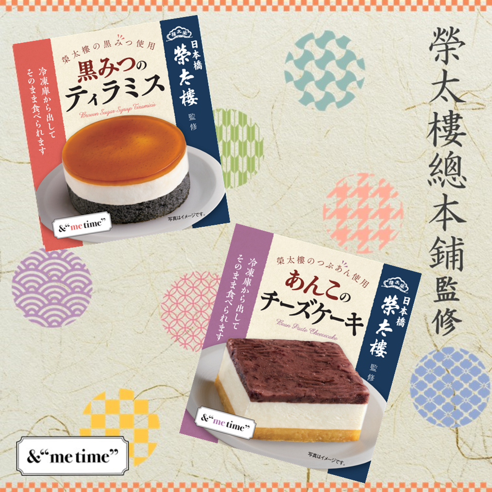 榮太樓總本鋪の黒みつを使用した「黒みつのティラミス」と、つぶあんを使用した「あんこのチーズケーキ」です。「冷凍庫にストックし、食べたいと思った時に解凍手間なく食べられる」アンドミータイムシリーズから和風素材を取り入れた新たな冷凍ケーキをお届けいたします。