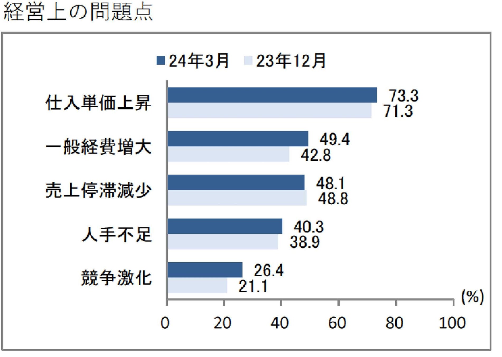 解決遠い 経営上の問題:「仕入単価上昇」73.3%「人手不足」40.3%