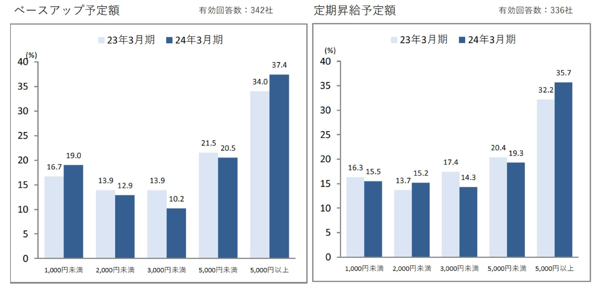 ベースアップ予定額は「5,000円以上」が37.4%、定期昇給予定額は「5,000円以上」が35.7%となり、金額ベースでも大きく上昇しています。