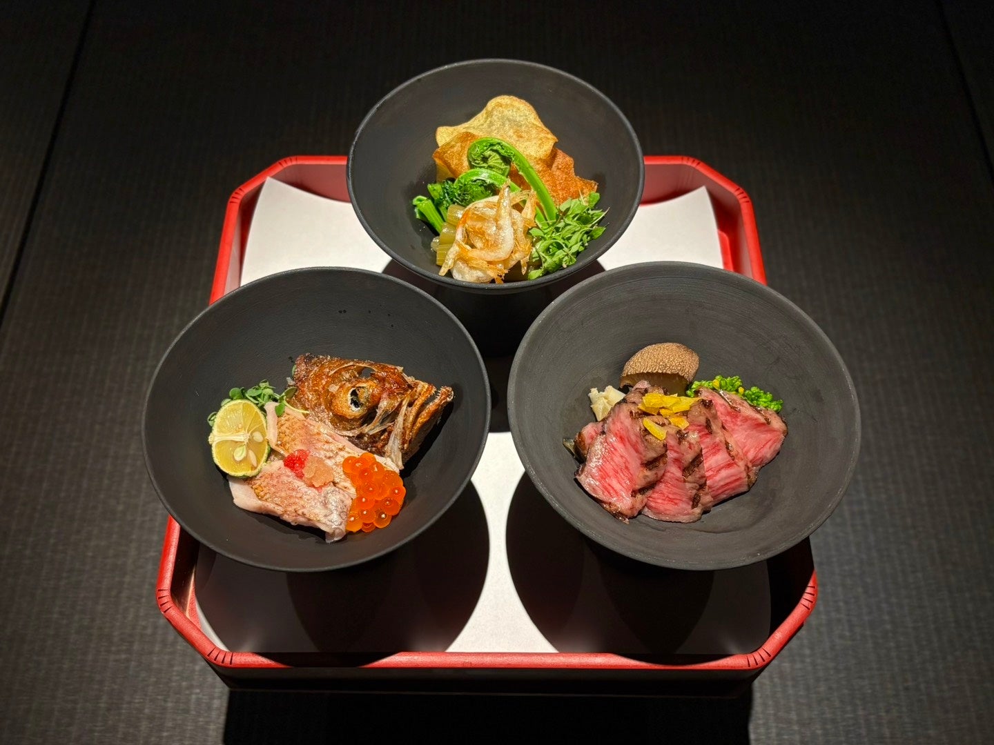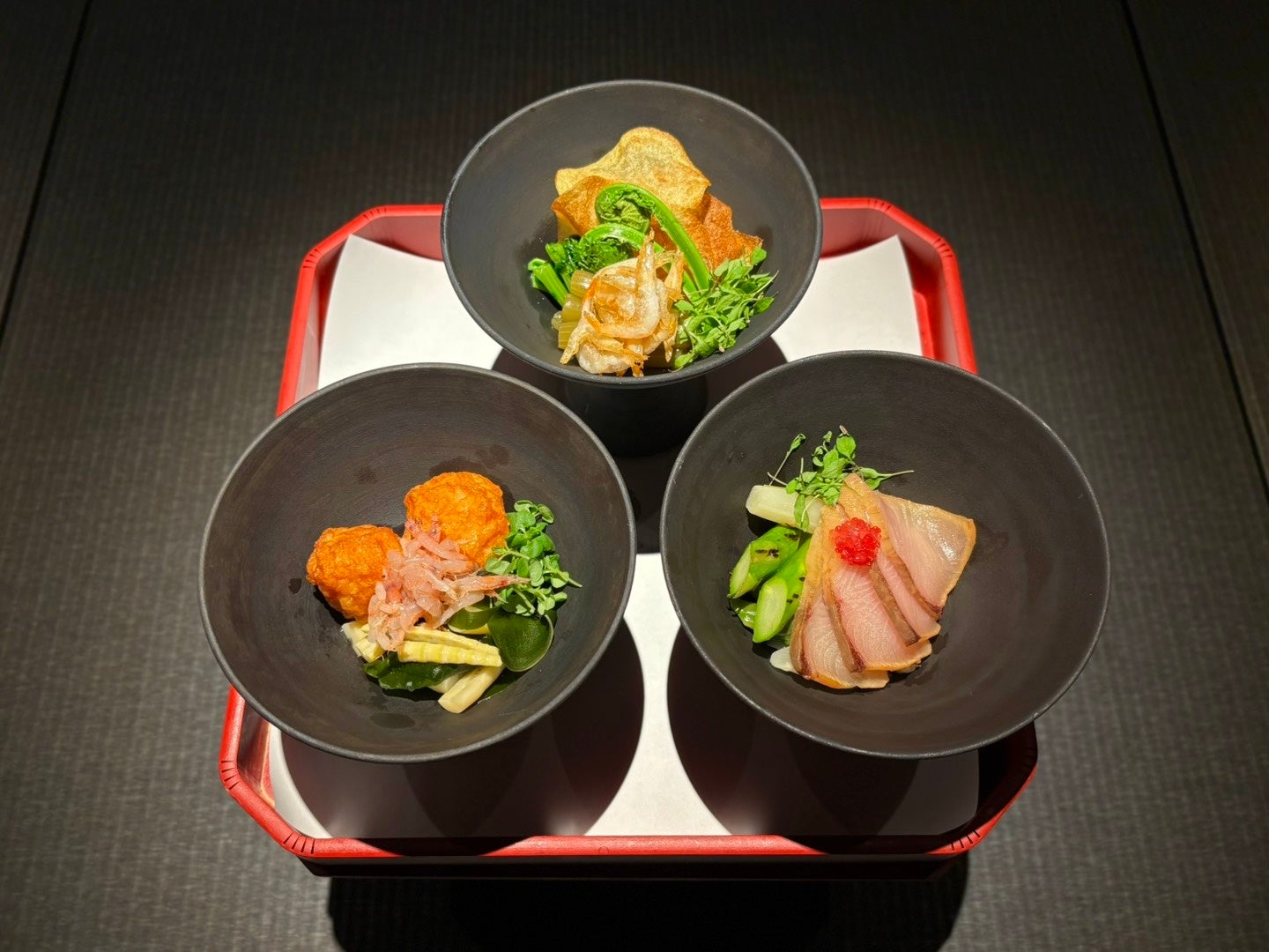 ◾️メニュー barrierでは、三方(さんぼう)をお膳として利用し、岡持ち(おかもち)に収められた三つのお椀料理に、サイフォンで抽出された一番出汁を注ぎます。 これにより、一杯のお出汁がお客様の食体験に奥深さと芳醇さを加えます。 barrierは、伝統的な日本料理のエッセンスを守りつつも、現代的なアプローチで新たな魅力を引き出すことを目指しています。 漆黒の空間で五感を研ぎ澄ませて、出汁に合う料理をお楽しみください。
