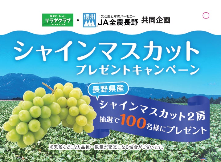 「JA全農長野(全国農業協同組合連合会 長野県本部)」と共同でプレゼントキャンペーンを実施します。2024年6月17日(月)から7月17日(水)の期間、対象商品についているバーコードを集めてご応募いただくと、長野県産「シャインマスカット」2 房が抽選で100名様に当たります。詳細はキャンペーンサイトをご確認ください。