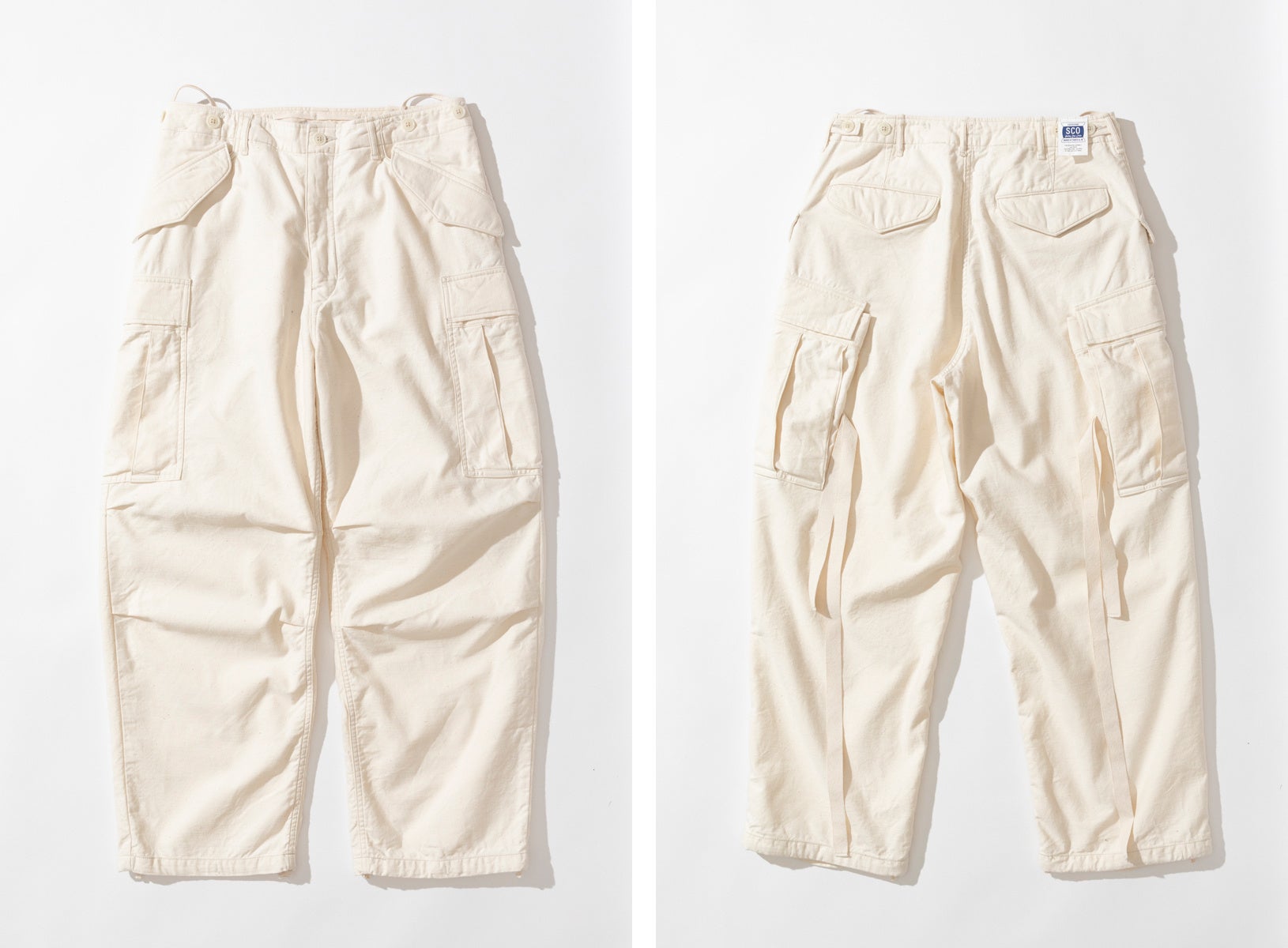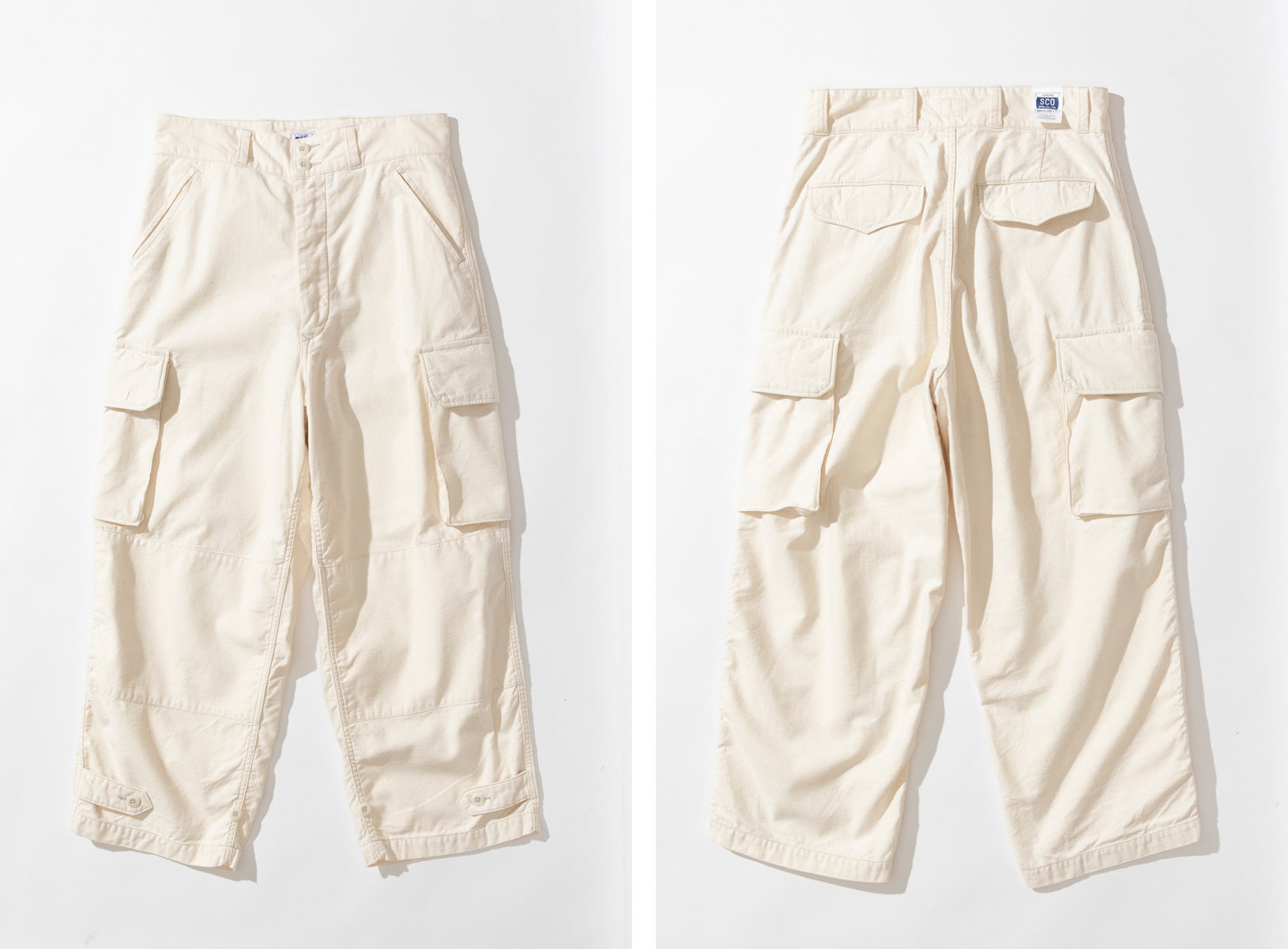 上記で紹介したモデル「SC111」と同じバックサテン生地を使用。どっしりとしたシルエットを尊重しつつ、ワタリから直線的にテーパードさせてスッキリ穿けるようにモデファイされています。その他、機能性を考慮した不揃いなベルトループや大きめのマチ付きのカーゴポケットなど、当時のディテールはそっくりそのまま。