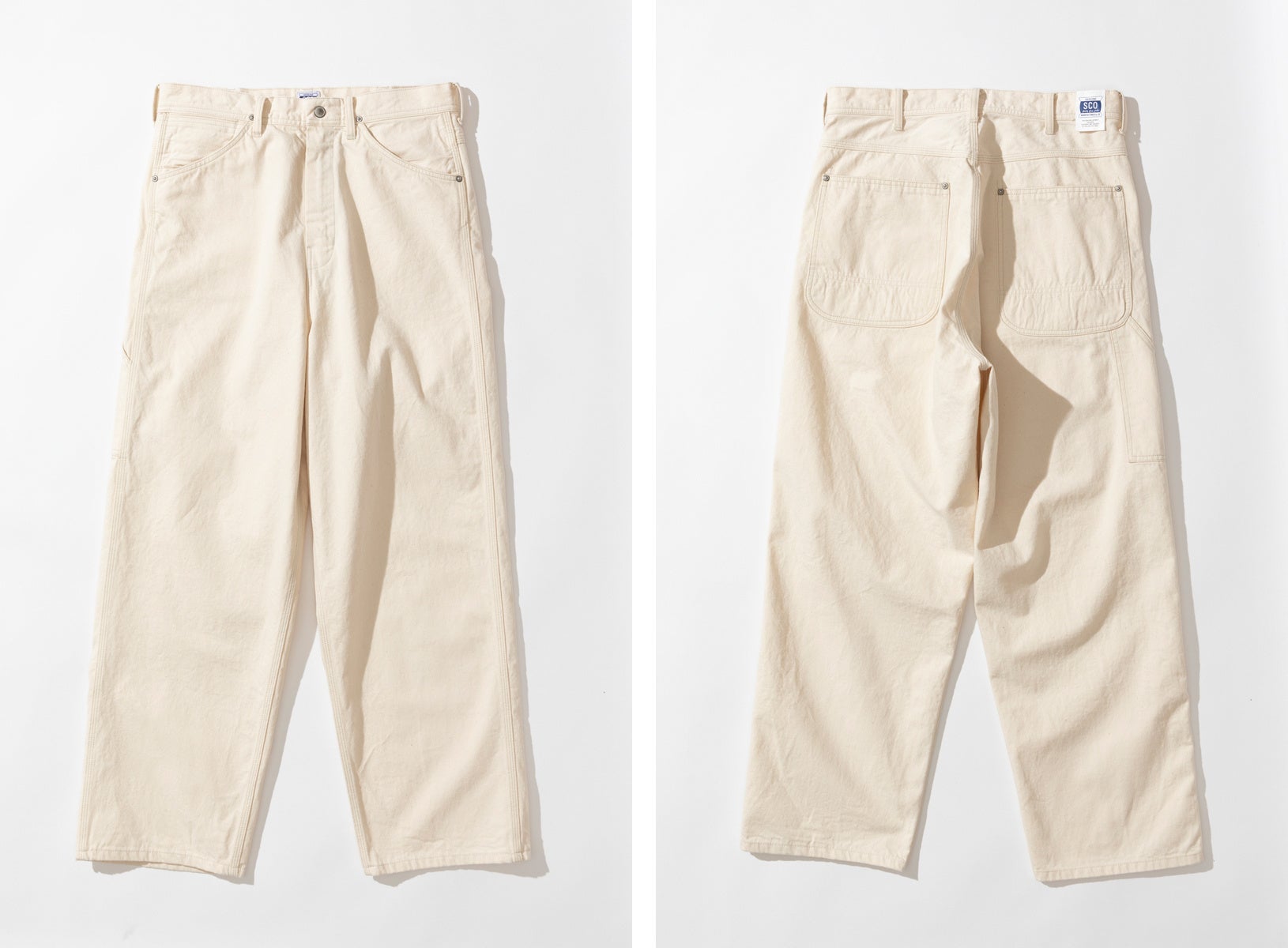春夏コーデの王道、ペインターパンツ。アメリカのヴィンテージデニムを元に作られた、ライトオンスのホワイトデニムで爽やかに仕上げながら、糸の打ち込みを限界まで強めて、ふっくらとした立体感を演出。また、1本針ミシンを2度掛けしたダブルステッチもポイント。あえてステッチワークを均一にしないことで、ワークウェアの粗っぽさを表現しています。