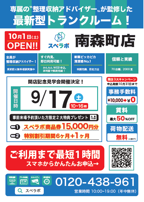 当社の大人気トランクルーム【スペラボ】は、新築で清潔感があり、地域最安値、専属の整理収納アドバイザー監修店舗。大変利用しやすいとご評価頂いております!136店舗(開業予定含む)3500室超を運営中!!