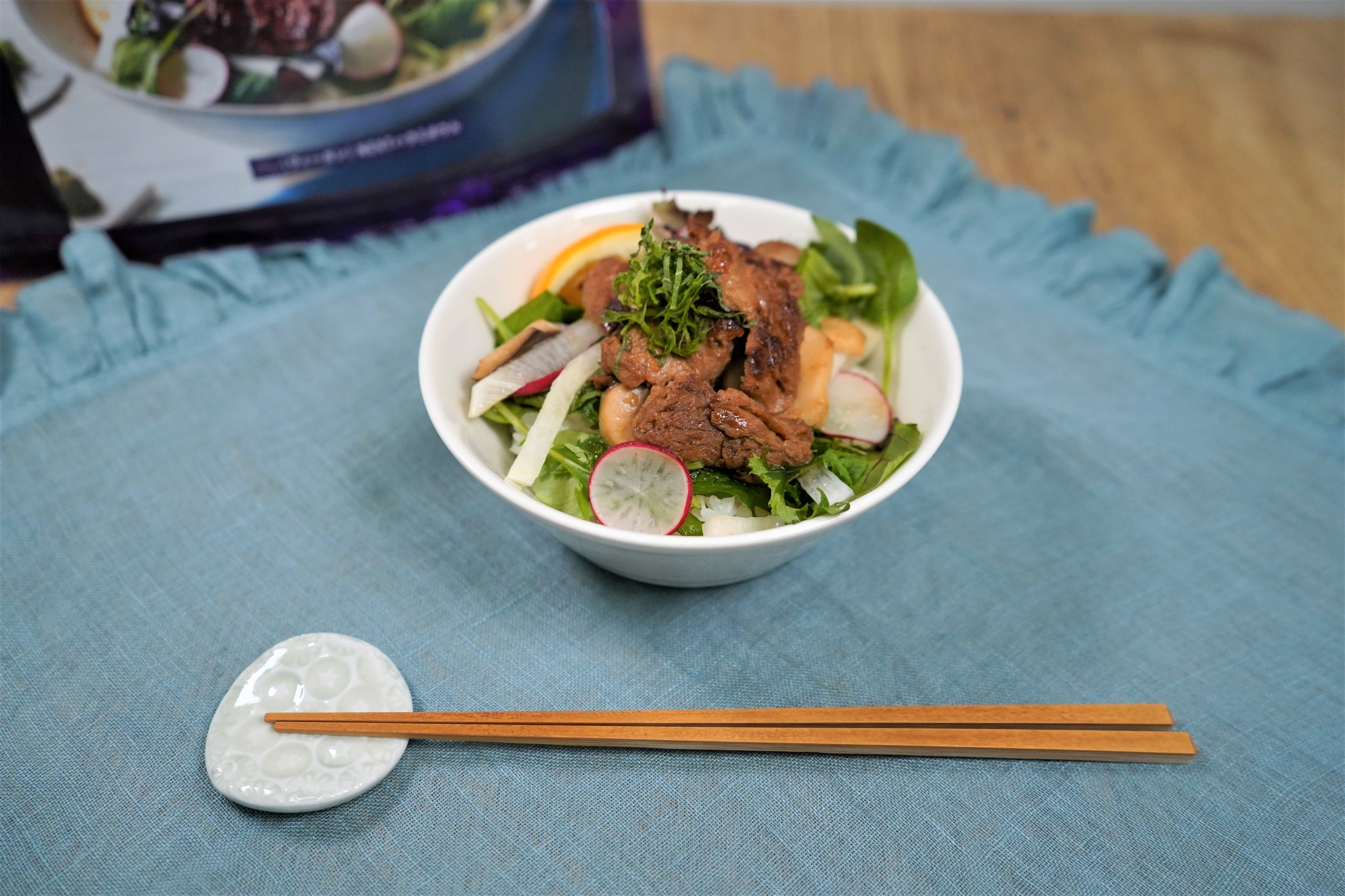 特徴:普通の焼き肉とはひと味違ったおいしさ!ギュッとした食感でヘルシーな 「NEXTハラミ1.1」を、野菜と食欲そそる香りのタレに合わせています。地球と身体に優しい丼に仕上げました。