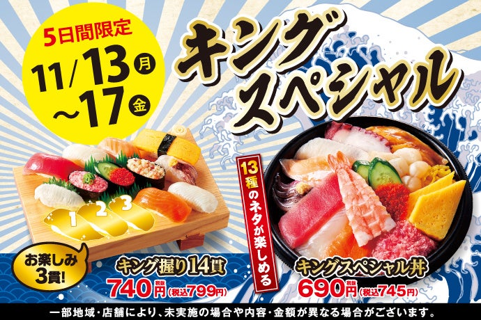 持ち帰り寿し店の「⼩僧寿し」「茶⽉」を運営する株式会社⼩僧寿しは、持ち帰り寿し店「⼩僧寿し」にて、11月13日(月)~17日(金)の期間限定で、「キングスペシャルフェア」を開催致します。
