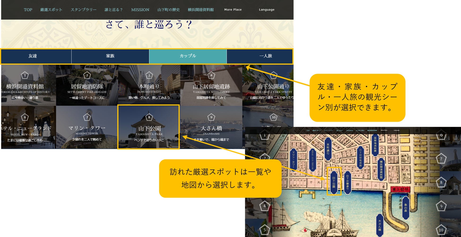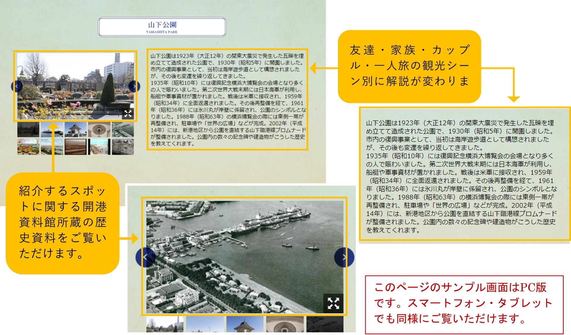 スマートフォンやタブレット、PCなどのブラウザから手軽にアクセスでき、その場所の歴史や文化の移り変わりを現在、目の前に映る街の姿と開港資料館が所蔵する歴史資料に見るかつての様子とを見比べながら知ることができます。厳選された10か所のスポット解説は専門職員が監修し、友達、家族、カップル、一人旅の旅行シーンにあわせて楽しんでいただけるコンテンツとなっており、それぞれ日本語のほか、英語、中国語(簡体字・繁体字)、韓国語に対応しています。巡った厳選スポットを記録するスタンプラリーや、知る人ぞ知るシャッタースポットを見つけてSNSに投稿できる「MISSION 山下町の”ヒミツ”を発見せよ」等の機能も備えています。