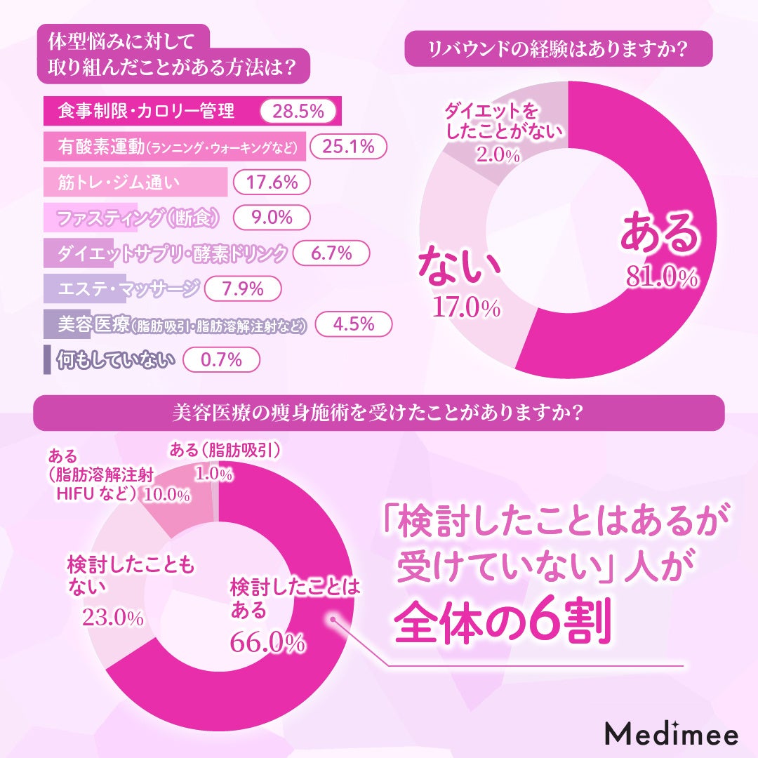【体型の悩みに対して取り組んだことがある方法は?(複数選択可)/「リバウンド」の経験はありますか?/美容医療の痩身施術を受けたことがありますか?】