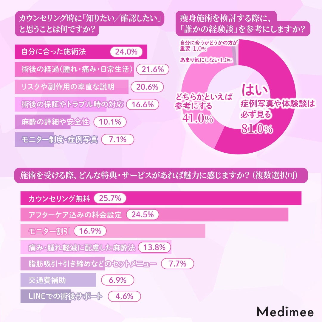 こうした結果から、痩身施術においては「納得感のある個別提案」と「信頼できる症例情報」の両立が、施術を前向きに検討するうえで大きな鍵となっていることがわかります。