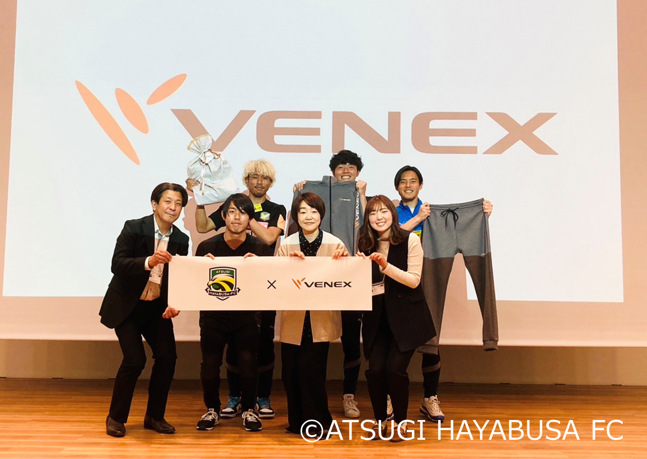 休養時専用の「リカバリーウェア」を開発、製造、販売する株式会社ベネクス(所在地:神奈川県厚木市、代表取締役社長:中村 太一、以下、当社)は、2023シーズンから関東サッカーリーグ2部へ昇格した「厚木はやぶさFC(旧チーム名:はやぶさイレブン)」(株式会社Sports Culture Development 代表取締役:宇野 陽、以下、厚木はやぶさFC)とのオフィシャルリカバリーウェアサプライヤー契約を今シーズンも継続します。レンブラントホテル厚木(所在地:神奈川県厚木市)で2023年3月19日(日)に開催された2023シーズンキックオフイベントにおいて、選手へリカバリーウェアの贈呈を行いました。