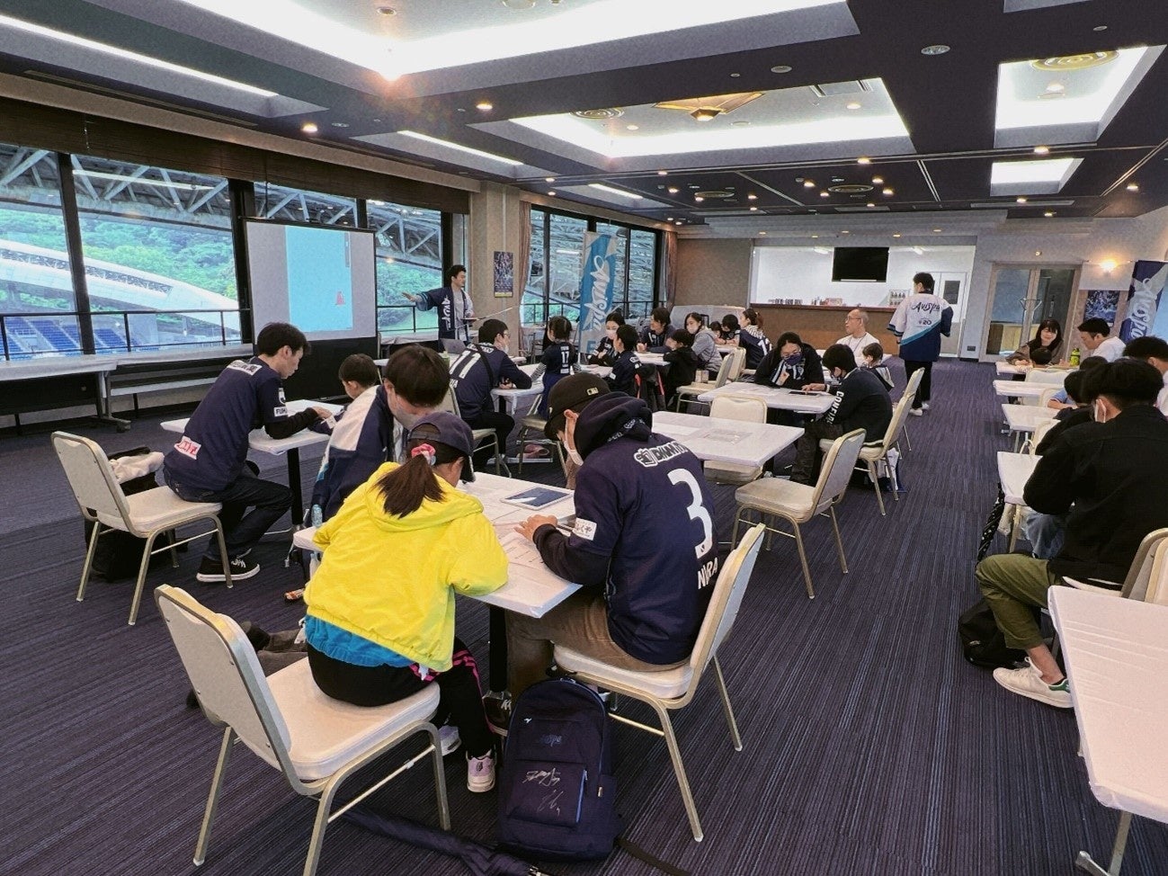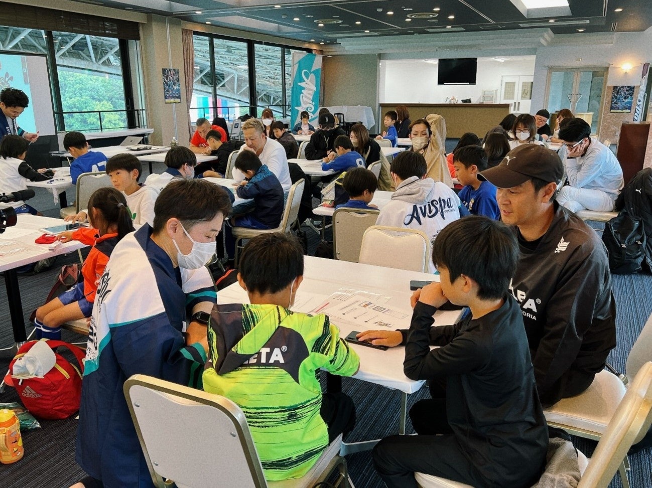 当日は朝11時30分スタートの第1回目、14時スタートの第2回目と、計2回のワークショップを開催致しました。第1回目は、当日ベスト電器スタジアムのピッチにて開催されたアビスパ福岡ジュニアスペシャルマッチに参加したチームの子供たちと保護者の皆さま、第2回目はシャレンパートナー各社の従業員ご家族の皆さまやアビスパDAOご家族の皆さま、福岡大学の大学生にご参加頂きました。