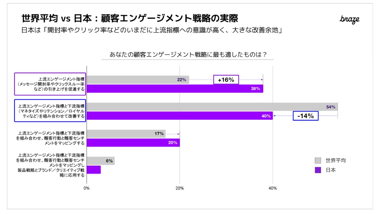 Brazeが2024年行った Braze Customer Enagement Review の調査結果によると、グローバルでは顧客エンゲージメントの上流と下流を組み合わせてビジネスを拡大させる志向が強い一方で、日本では開封率やクリックのなど上流への意識の強さが明らかとなりました。