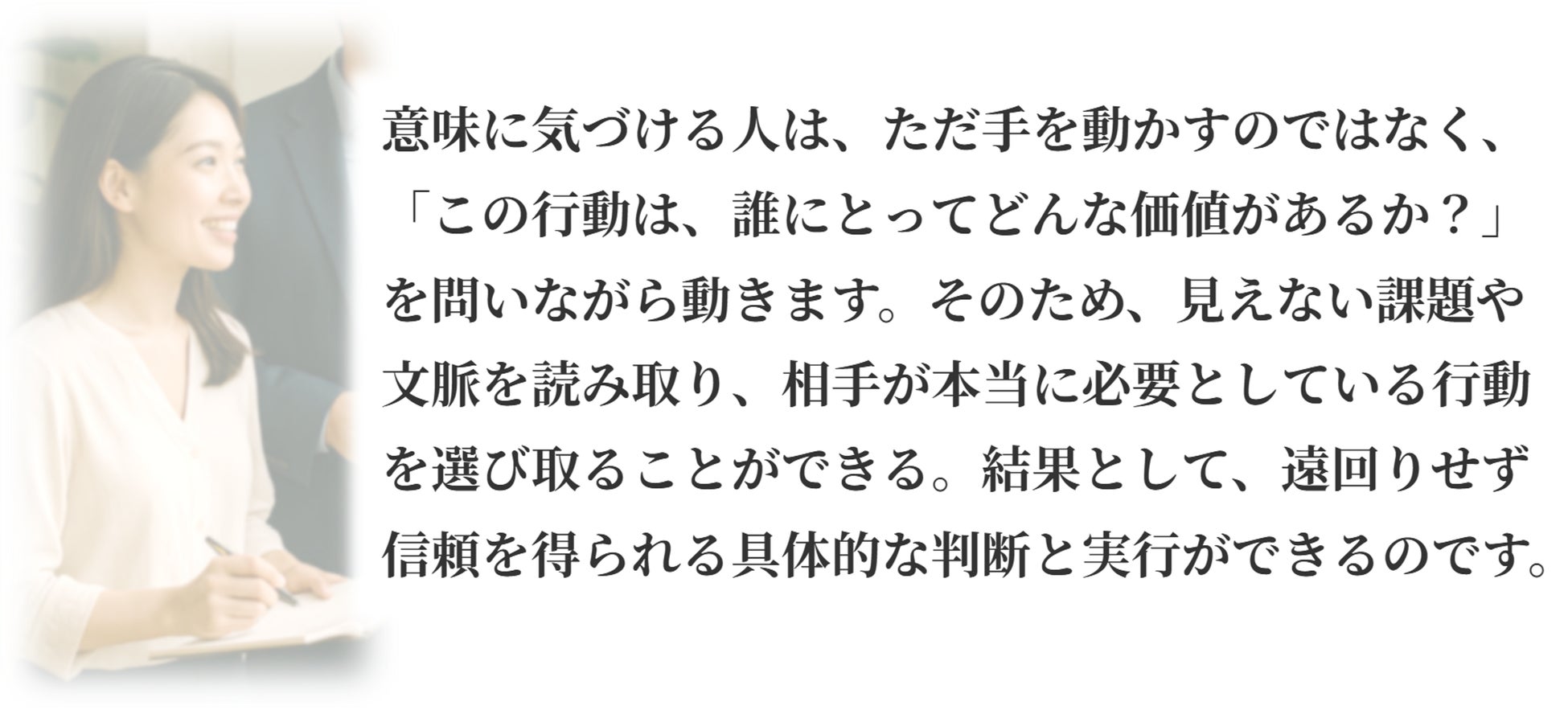 意味に気づける人は、ただ手を動かすのではなく、「この行動は、誰にとってどんな価値があるか?」を問いながら動きます。そのため、見えない課題や文脈を読み取り、相手が本当に必要としている行動を選び取ることができます。結果として、遠回りせずに信頼を得られる判断と実行ができるのです。