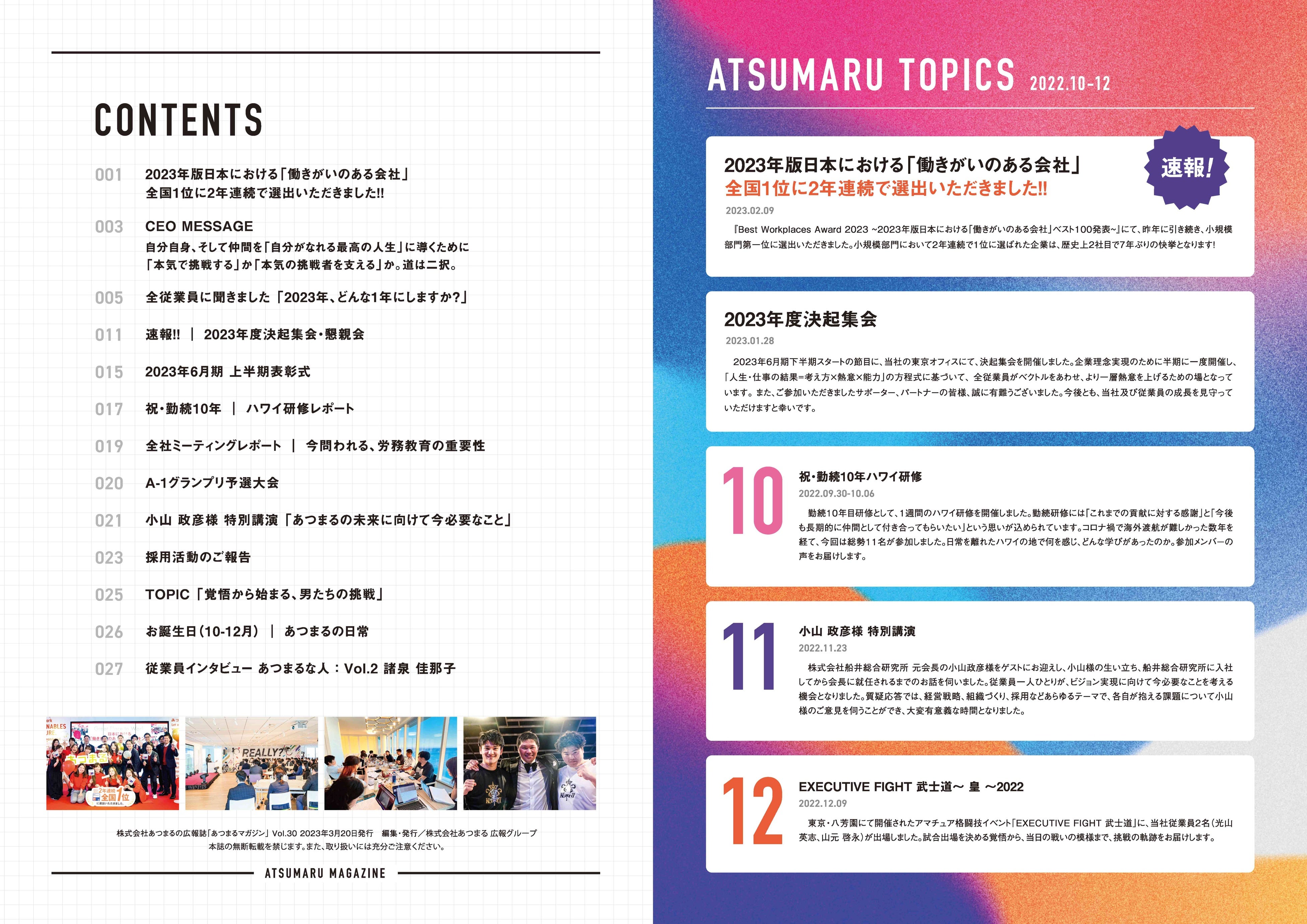 2023年3月20日、株式会社あつまる(本社:東京都渋谷区、代表取締役社長:石井 陽介)は、広報誌「あつまるマガジン」Vol.30(2023年3月号)を発行いたしました。