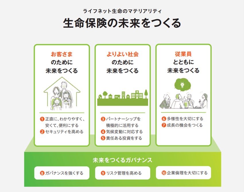 当社は、長期に取り組むべきマテリアリティ(重要課題)を特定しています。「生命保険の未来をつくる」をテーマとして、以下の1から10までを当社のマテリアリティとして認識し、「お客さま」「社会」「従業員」のステークホルダーに対して取組みを進めるとともに、経営の基盤となる「ガバナンス」を継続的に強化してまいります。