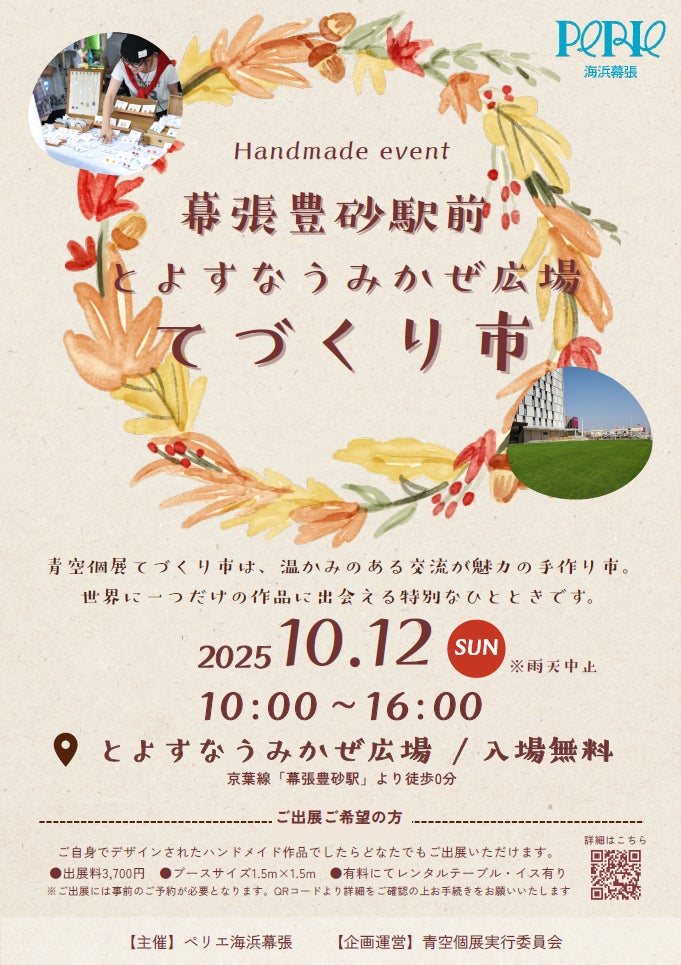 株式会社千葉ステーションビル(本社:千葉市中央区、代表取締役社長:杉村 晶生)が運営する商業施設「ペリエ海浜幕張」は、JR幕張豊砂駅前広場にて、出展される作家さんが自身で全ての商品を手作りし販売する形のフリーマーケット「とよすなうみかぜ広場 てづくり市」を、10月12日(日)に初開催いたします。