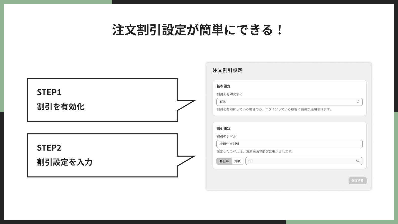 「シンプル会員注文割引|お手軽ログインセール設定」では、簡単に注文割引を設定できます。